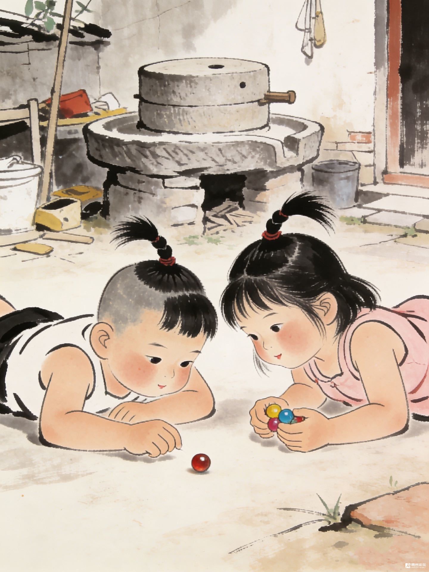 大人总说“快起来,地上凉”,可他俩听不见。弹珠转的圈、指尖碰地的痒、还有彼此眼里的光,早把日头晒出的暖,都锁进这一小片泥地里了——天知道,玻璃珠里的世界,比石磨盘还大呢。