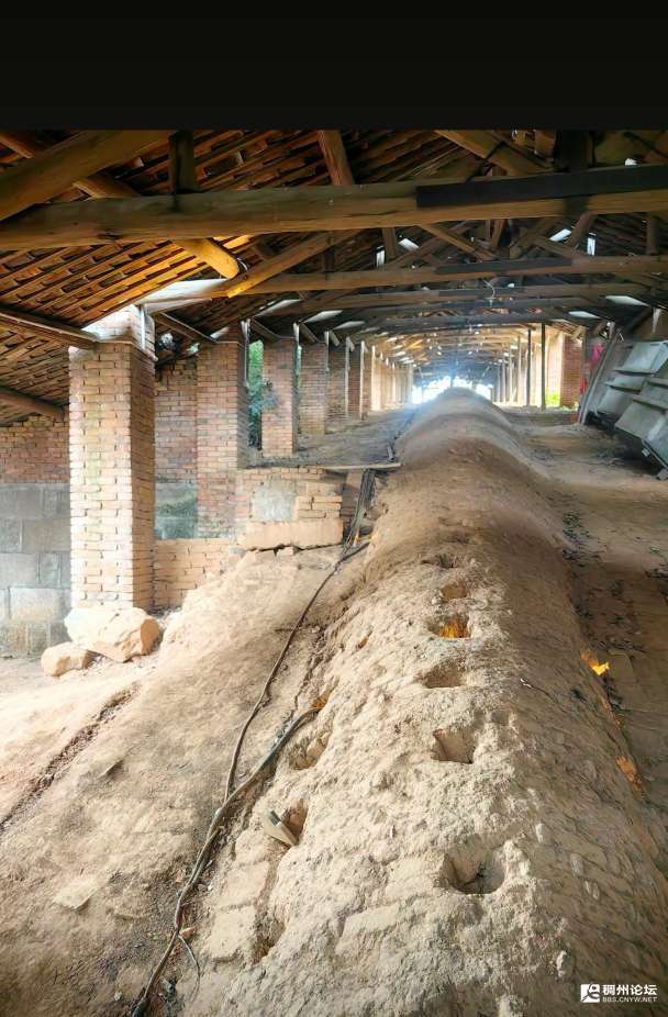 龙窑之建,最妙在顺势而为。匠人们不违山形,不逆地势,依着东高西低的坡势,砌出三十度的缓陡之坡,以自然之向造抽风之力,无需机械鼓风,只凭天地之气,便让火焰顺着窑身蜿蜒而上,如游龙穿窟,遍暖窑室。窑身六十丈长,两丈余宽,隧道般的拱顶由青砖错缝砌筑,砖缝间以耐火泥抿实,经千百度烈火反复炙烤,内壁凝出一层莹润的窑汗,如琉璃覆壁,既阻热气外泄,又护窑体千年不摧。两侧与拱顶,星罗棋布着数百个投柴孔,如龙鳞般排布,是控温的秘钥,匠人们凭火色辨温,听窑音知势,添柴减薪,皆在方寸之间,让窑内始终保持千二百度的恒温,烧出的陶器,胎质坚密,釉色匀净。