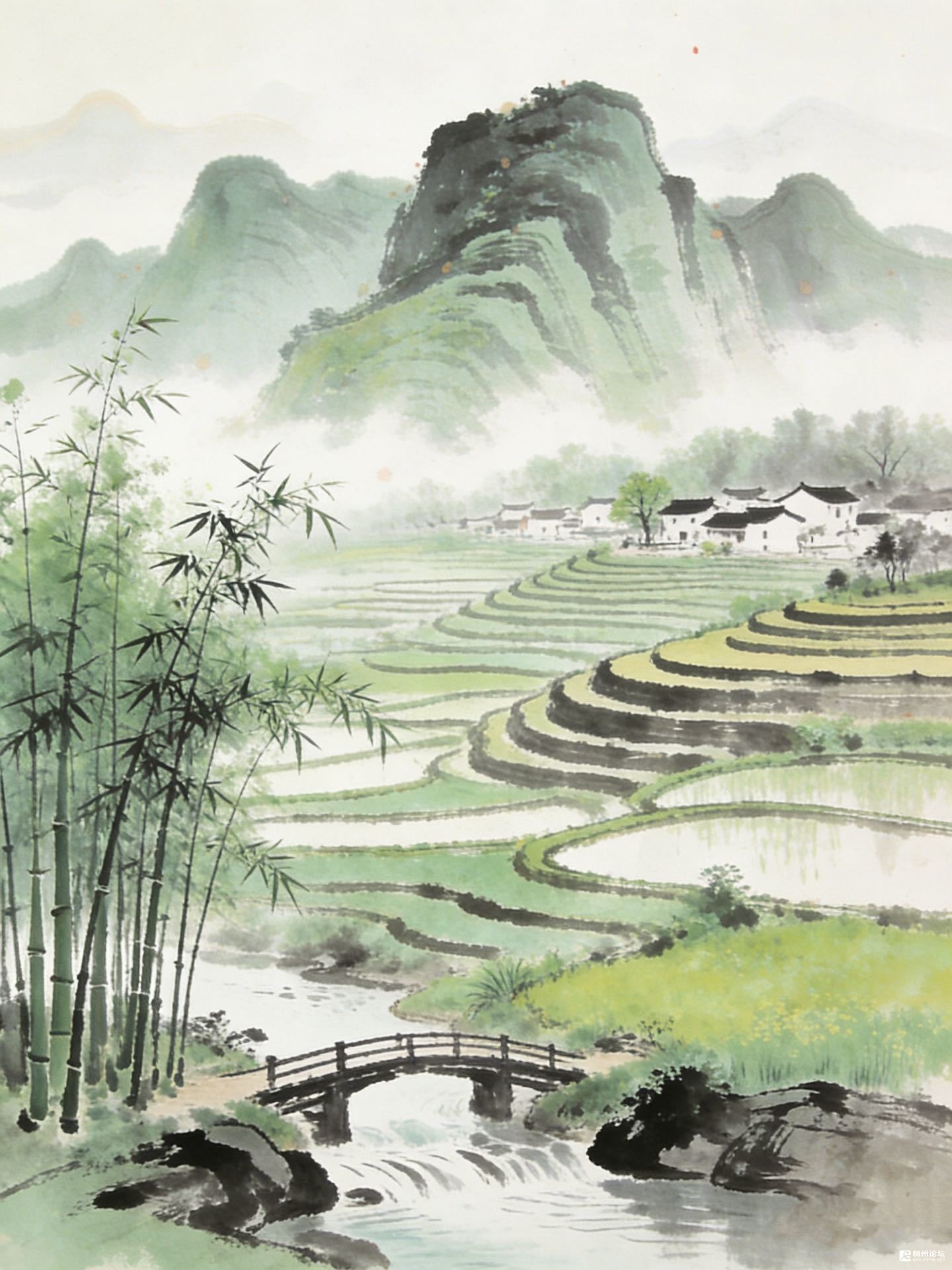 山把云揉进褶皱里,梯田便成了蘸着绿墨的笔,在大地上一圈圈晕染。竹是竖起来的骨,溪水是淌着的魂,木桥横在那儿,倒像是为了把这流动的绿,都拢进怀里。