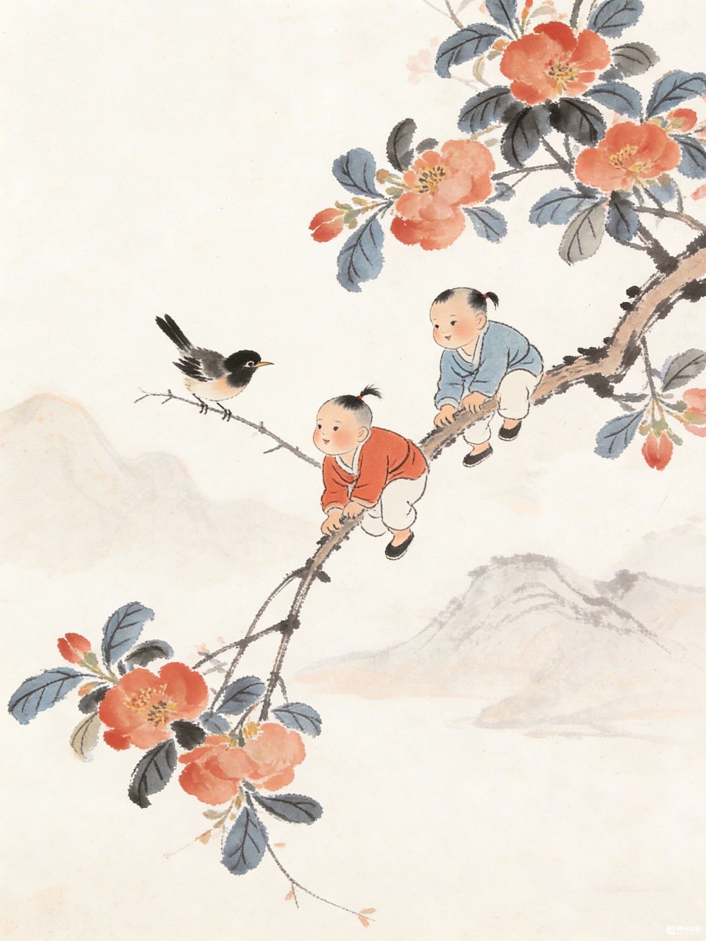 远山淡得像没睡醒,云气在山尖绕,也绕不进这枝头的热闹。蓝衫娃娃把辫子甩在花上,红瓣簌簌落,倒像是给鸟撒了把碎霞。