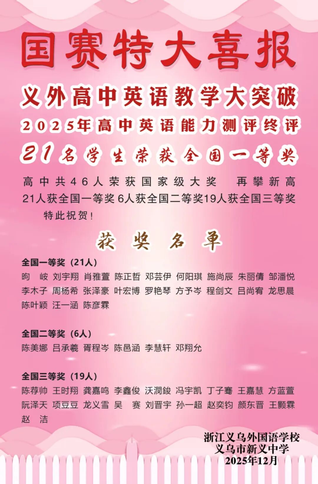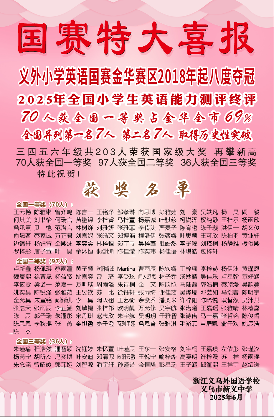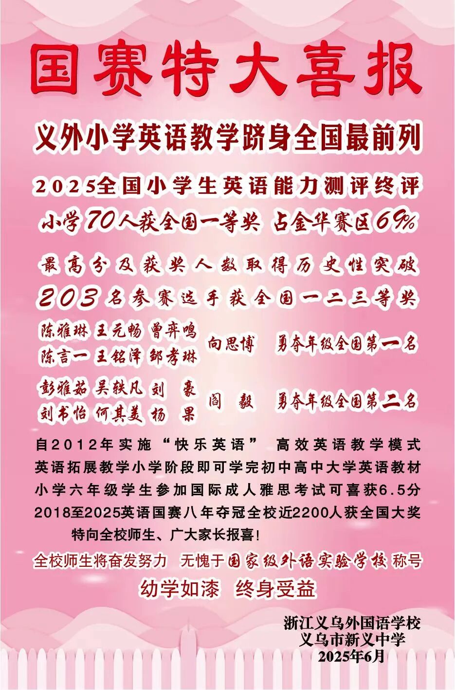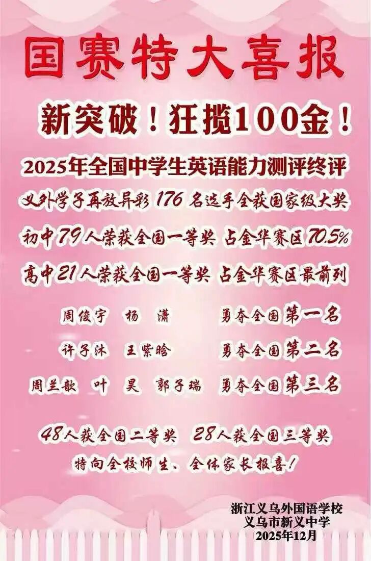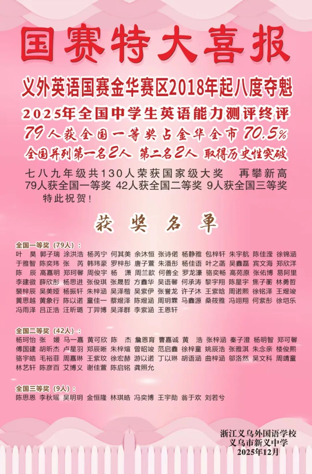2025年全国中小学生英语能力测评决赛,379人次获全国大奖。其中,小学部70人获全国一等奖,占金华全市一等奖总数的69%;初中部79人摘得全国一等奖,占据金华全市70.5%——这意味着每3名金华地区的一等奖获得者中,就有2名来自义外!高中部同样亮眼,21人荣获全国一等奖,获奖总数与高等级奖项数双双刷新纪录。尤为可喜的是,陈雅琳、王元畅、曾弈鸣、陈言一、王铭泽、邹孝琳、向思博、周俊宇、杨潇9名同学并列年级全国第一,彭雅茹、吴轶凡、杨果、阎毅、刘书怡、刘豪、何其美、许子沐、王紫晗9名同学并列年级全国第二,叶昊、郭子瑞、周兰歆3名同学并列全国第三。