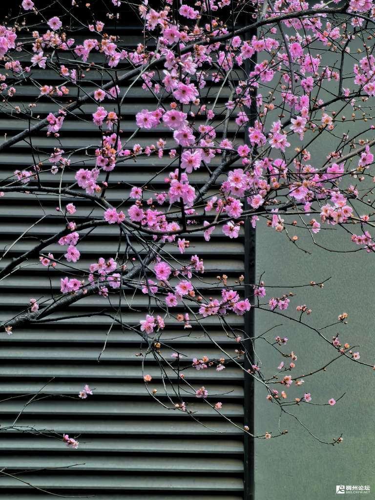 义乌市壹号院庆云二区,小区里的深灰的百叶窗和墙面,与美人梅粉嫩的花枝形成了强烈的视觉对比,让花朵显得格外柔美。