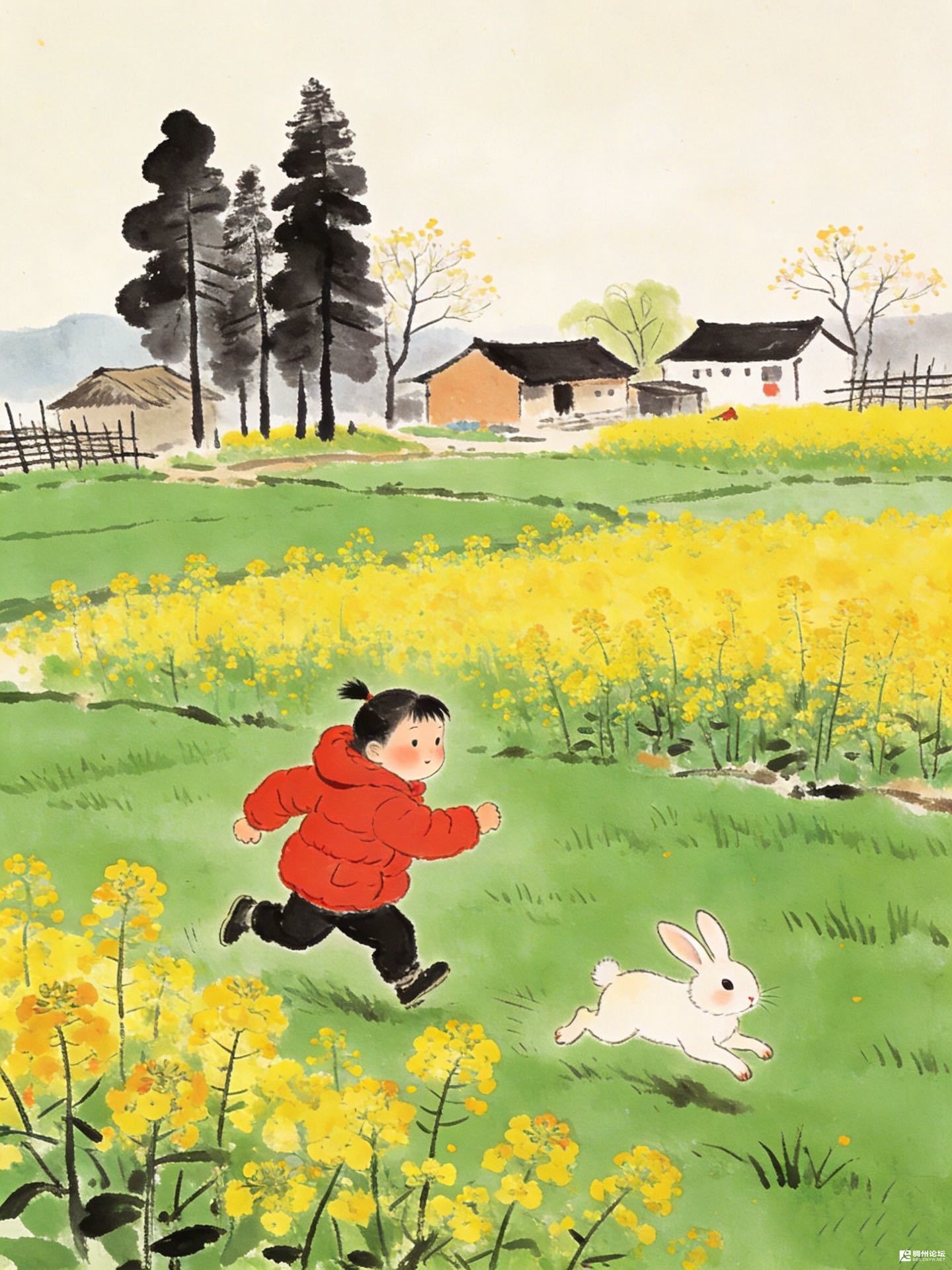 菜花把黄泼得没边没际,像谁把太阳的碎金全抖进了地里。红袄子的小姑娘追着白兔跑,风把她的辫梢吹成只蹦跳的雀儿。