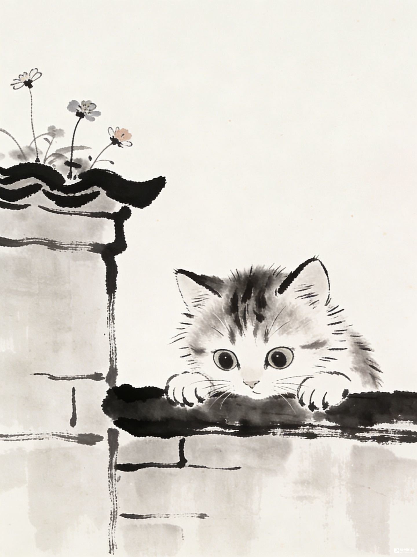 它把爪子搭在墙头,眼睛圆得像盛了两汪墨。墙根的花也探着脑袋,白的、粉的、紫的,像把碎星星撒在墨色瓦檐上。