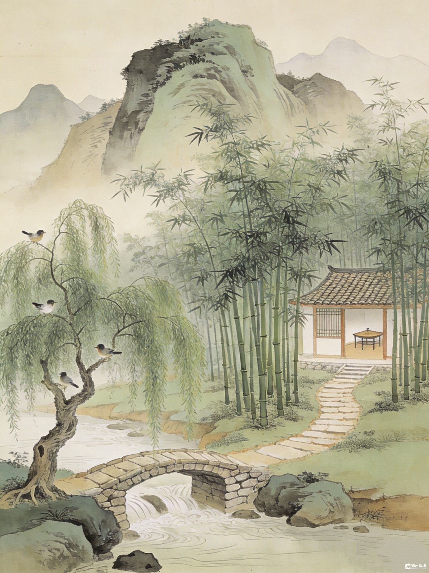 竹影把石阶切成细条,每走一步,都像踩碎了片绿云。溪水从石桥下挤过,把碎银似的光,溅在柳树枝上——那几只鸟便成了会动的墨点,在绿丝绦里跳来跳去。