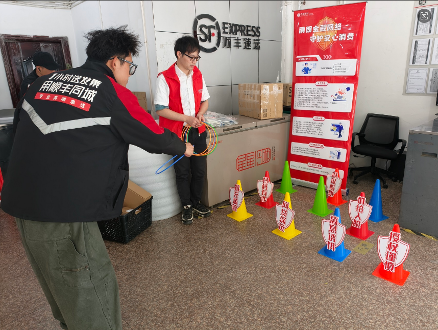 寓教于乐,互动游戏强化记忆。活动现场设置了“清朗网络·安心派送”套圈闯关和消保知识问答两个互动环节。套圈闯关区摆放着“陷阱桶”和“安全桶”,桶身分别标注“非法代理退保”“互联网贷款乱象”“冒用监管名义”等常见诈骗类型,快递员通过投掷套圈在轻松氛围中加深对金融陷阱的辨识度。知识问答区抽题箱内装有金融消保题目,快递员随到随答,实现边玩边学。