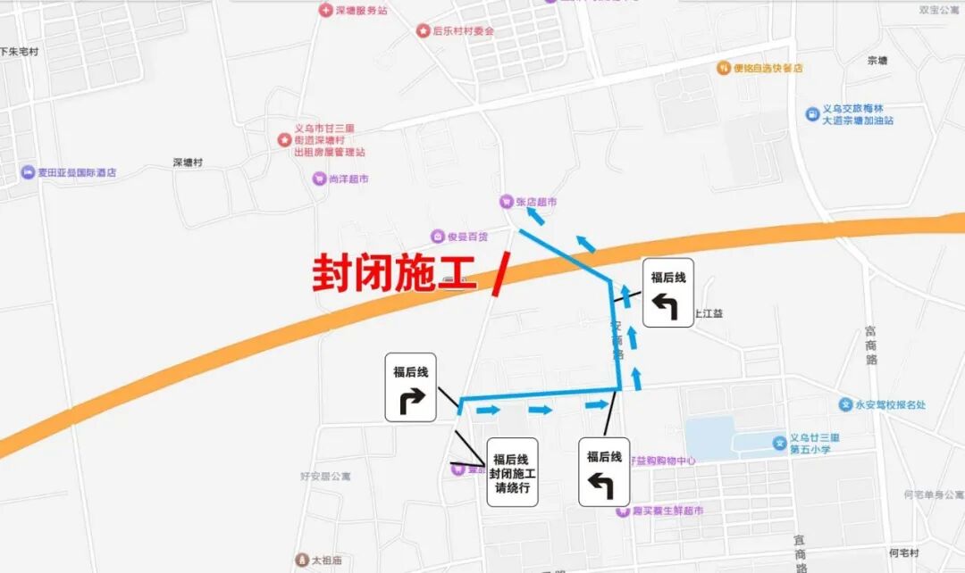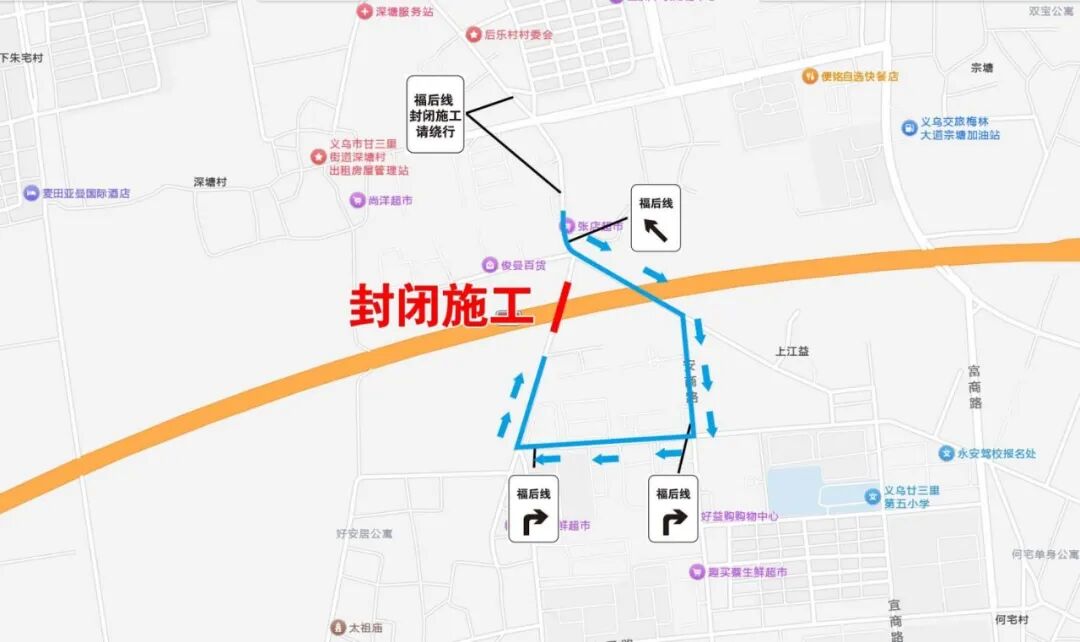 因甬金高速公路改扩建工程建设需要,定于2026年3月15日至2026年4月30日廿三里街道福后线(后义村)路段封闭施工(工期45天)。封闭期间过往车辆从福亭线至安商路至德民路绕道通行。(绕行线路如下图): 施工期间,请过往车辆提前规划好通行路线,并服从交警及现场管理人员的指挥,因施工带来的不便,敬请谅解! 特此公告。 义乌市廿三里街道办事处 义乌市公安局交通警察大队 2026年3月12日 来源 | 义乌交警 义乌市融媒体中心 |