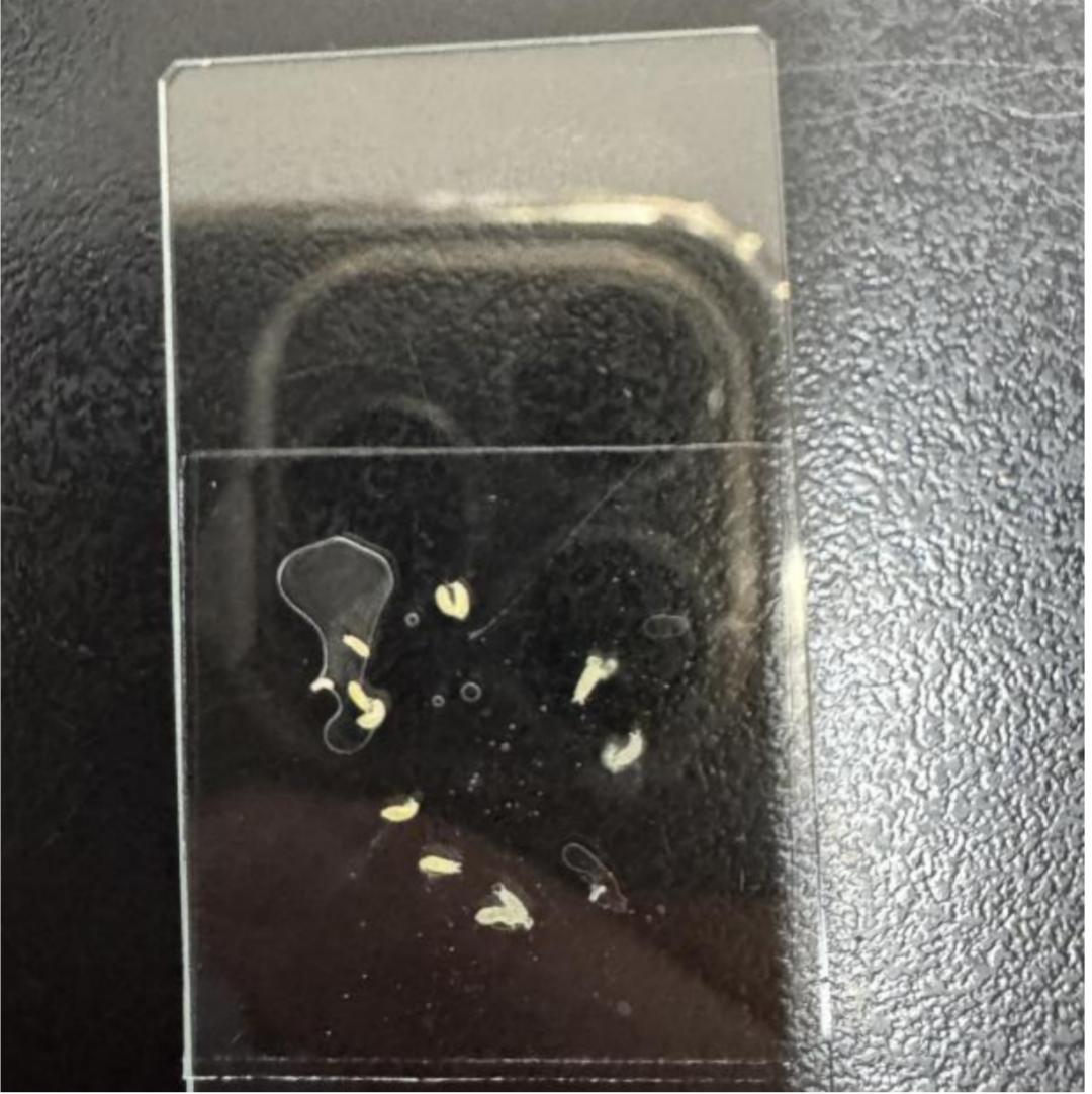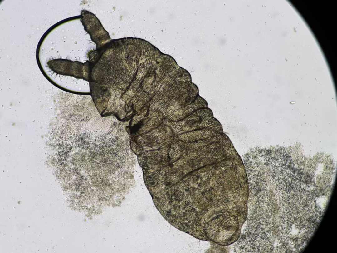 检验科医生立刻上手检查,把盒子里的几只虫子挑出来,放在滴了生理盐水的玻片上观察。肉眼看这些虫子,长度为2~3毫米,又在400倍显微镜下仔细看了虫体细节。