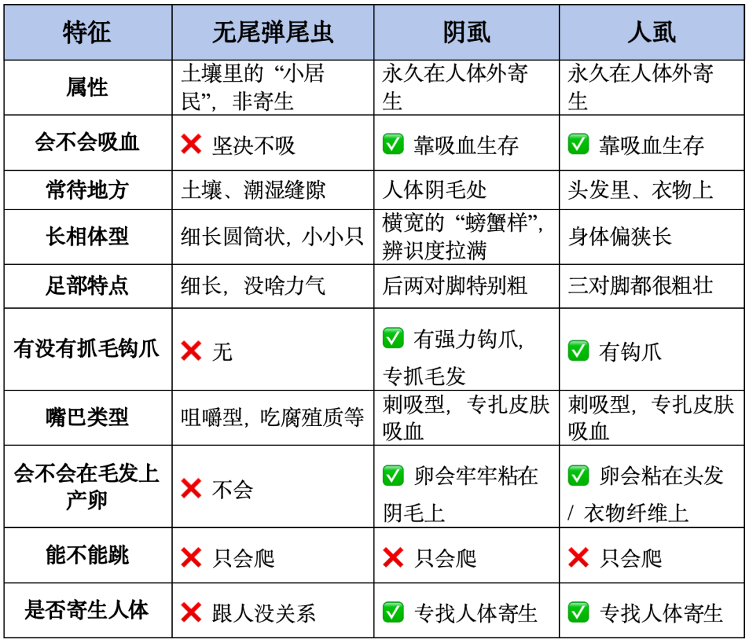 虽然无尾弹尾虫没危害,但阴虱、人虱可是会寄生人体、带来不适的 “真麻烦”,光看小虫子很容易懵,一张表帮你彻底分清,再也不认错: