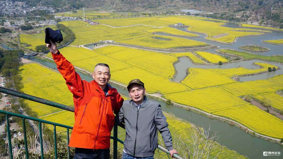 此时,文友摄影师张同乐老师热情地招呼大家:"来来来,我为各位挨个拍照!"张老师是义乌摄影界的名家,镜头下的人物生动自然,风光照片更是屡获大奖。在他的镜头下,七十多位文友笑容灿烂,背景是壮丽的十三渚全景——金黄的油菜花海、蜿蜒的桃江、巍峨的石柱峰、鬼斧神凿的玉壶岩,每一张照片都定格了这美好的瞬间。大好风光尽揽眼底,大家心旷神怡,久久不愿离去。