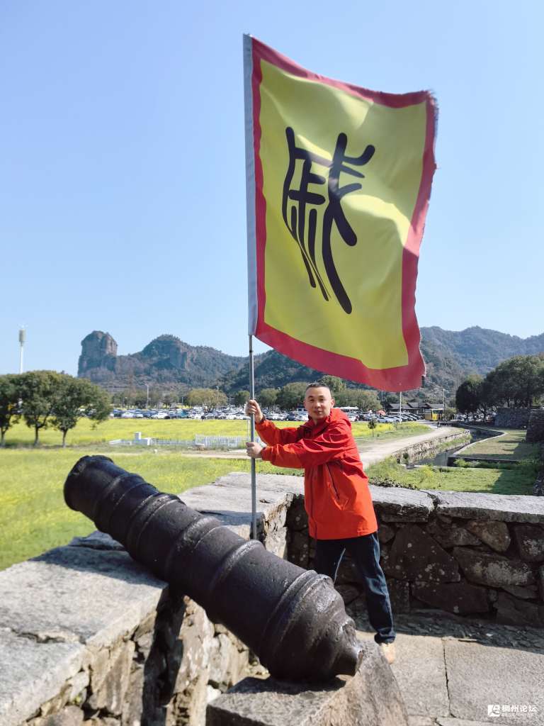 在城墙的制高点,一门铁炮静默地矗立着,炮口指向东海方向,仿佛随时准备轰击来犯之敌。炮身斑驳,见证了数百年的历史沧桑。戚家军的旗帜迎风飘扬,旗上的"戚"字依然醒目,让人不禁想起当年戚家军在此抗倭的英勇场面。