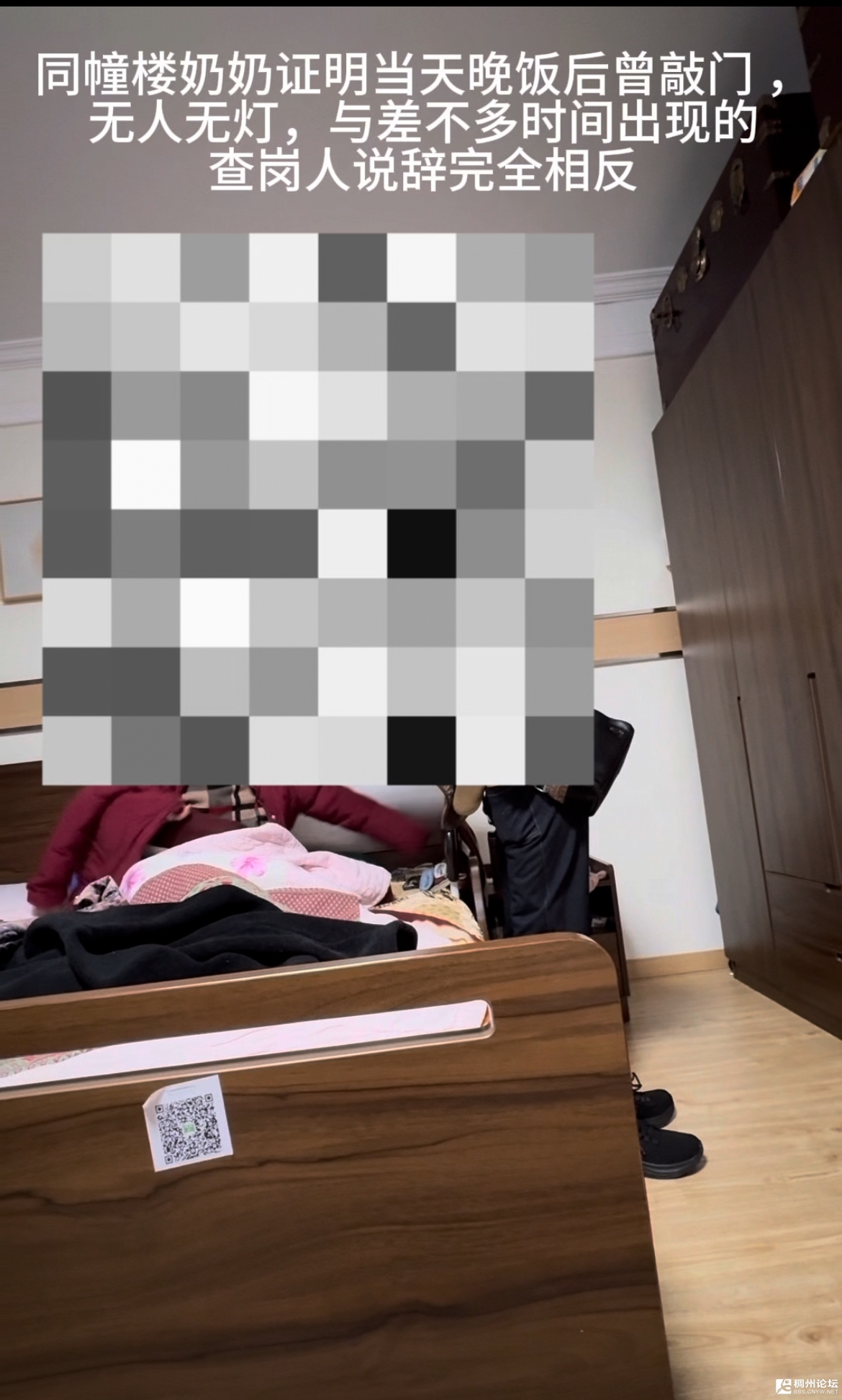当日 5:20 左右的巡查护工,说通过门外小窗看到父亲一人在客厅,当质问为何不进门数人头时,称老人不喜欢他人进房;可几天后发现端倪再沟 通,却突然改口说看到两位老人都在,甚至将不按要求进门巡查的责任,推卸到我们家属身上,说我们在室内装了监控,母亲东西藏丢了我们还帮助查监控,说明对他们不信任。