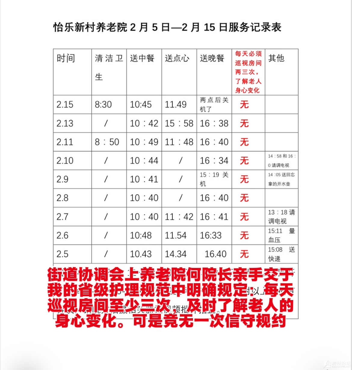 更揪心的是我们翻看房间内 2 月 5 日至 15 日的监控,整整十一天,护 工没有一次进房巡视(见附件图片),这与院方何院长在协调会上出示的《省级护理规范》 “每日至少巡视房间三次,了解老人身心变化“完全相悖(见附件图片)。