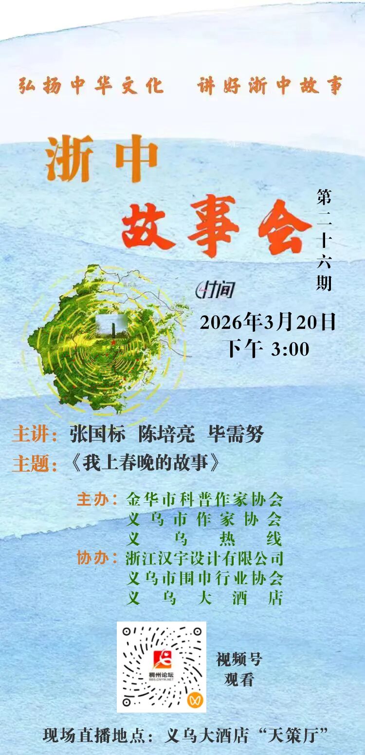 春分时节,春暖浙中;春晚义乌,全球瞩目。第26期《浙中故事会》将于3月20日下午3点在义乌大酒店四楼天策厅开讲。