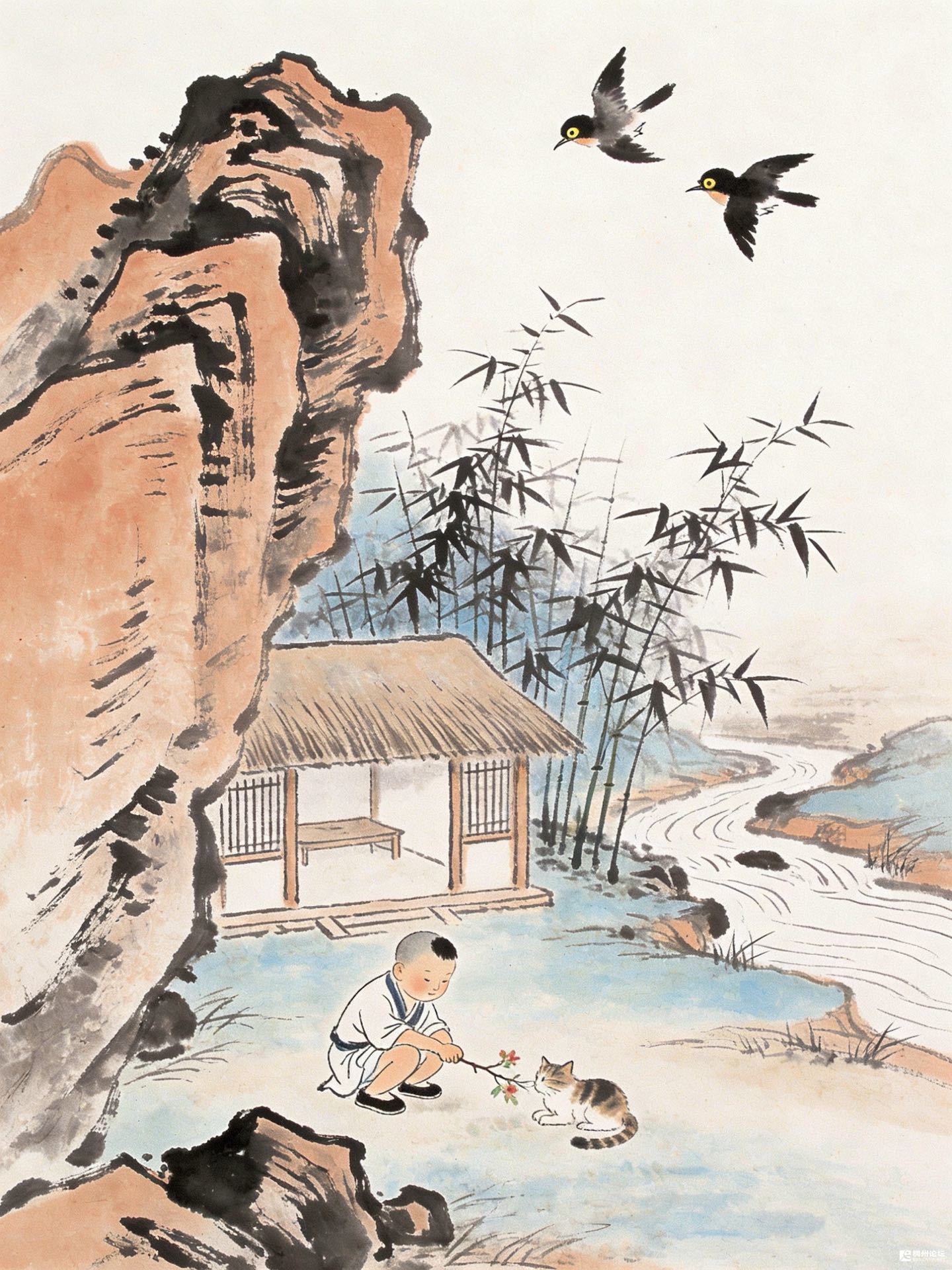 草屋的柴门虚掩着,里头的木凳还空着。大人们总说“要干正事”,可山不催,水不赶,连猫和鸟都由着性子。他就这么蹲着,看猫的尾巴卷成小问号,看花枝的影子,在猫毛上晃成碎金片。