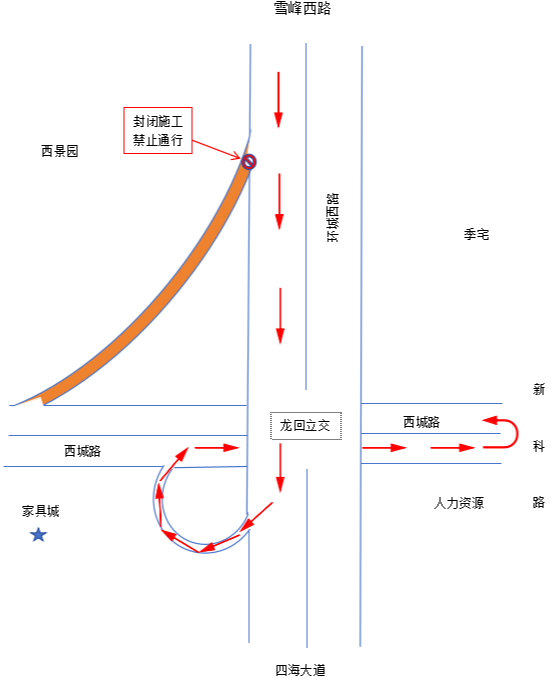 三、2026年3月31日21:00至4月1日5:00,4月1日21:00至4月2日5:00(雨天顺延),对环城西路(往四海大道方向)龙回立交右转匝道封闭施工,往城西、上溪方向的车辆请走西环城西路—西城路新科路(掉头)绕行。