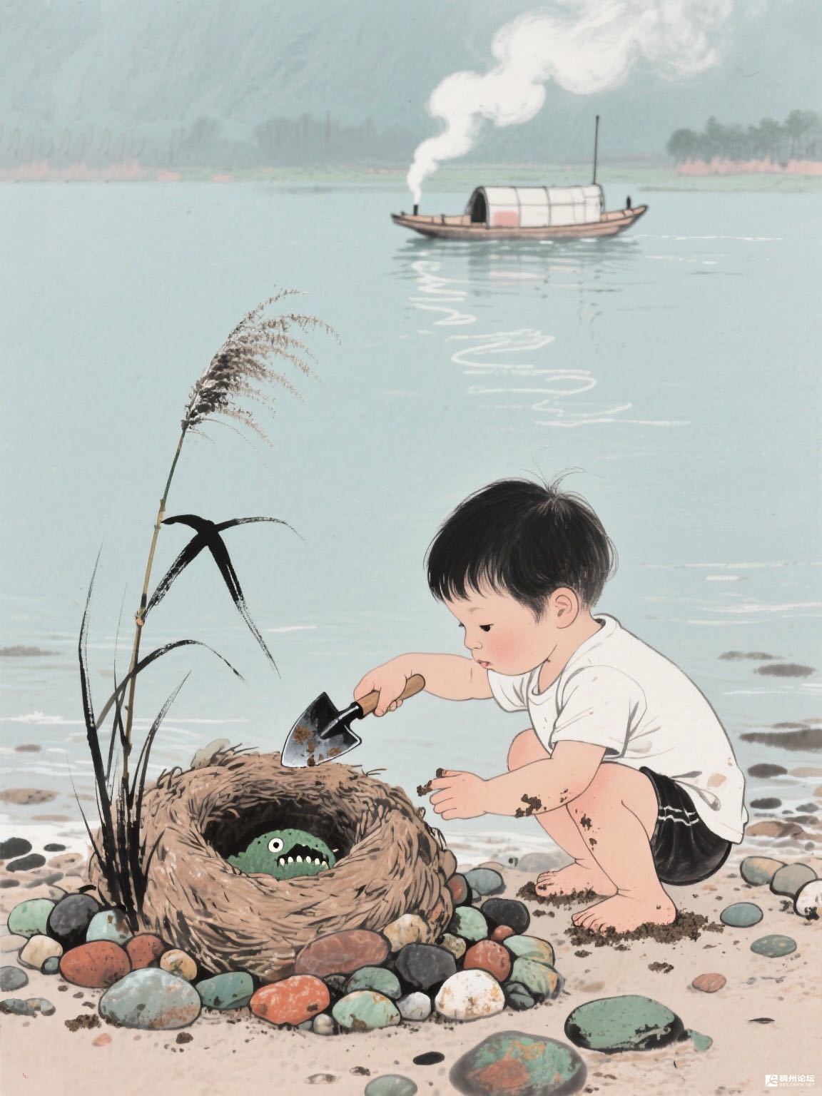 芦苇把风梳成细辫子,飘在水面上。我蹲在石子堆里,小铲子刚碰到草窝,里头就探出个绿莹莹的家伙,牙齿白得像刚晒过的贝壳。