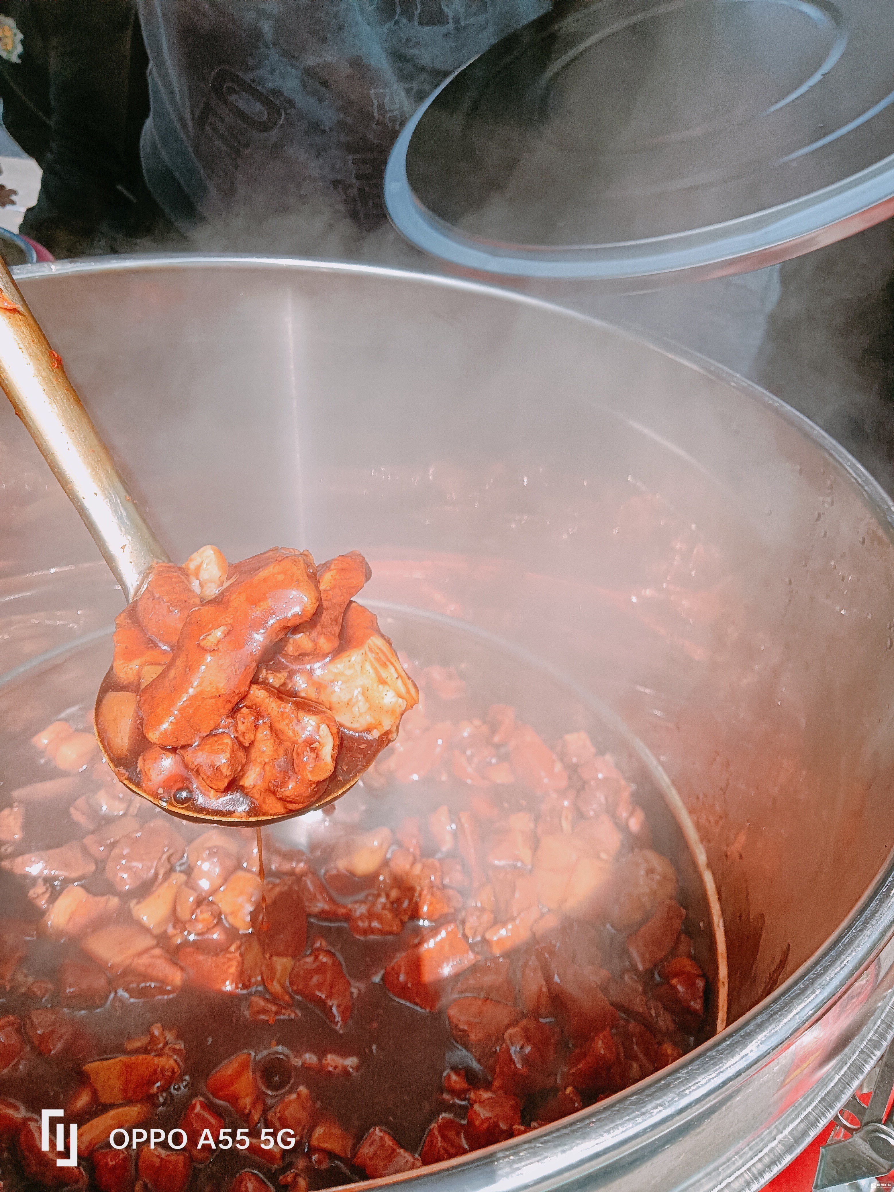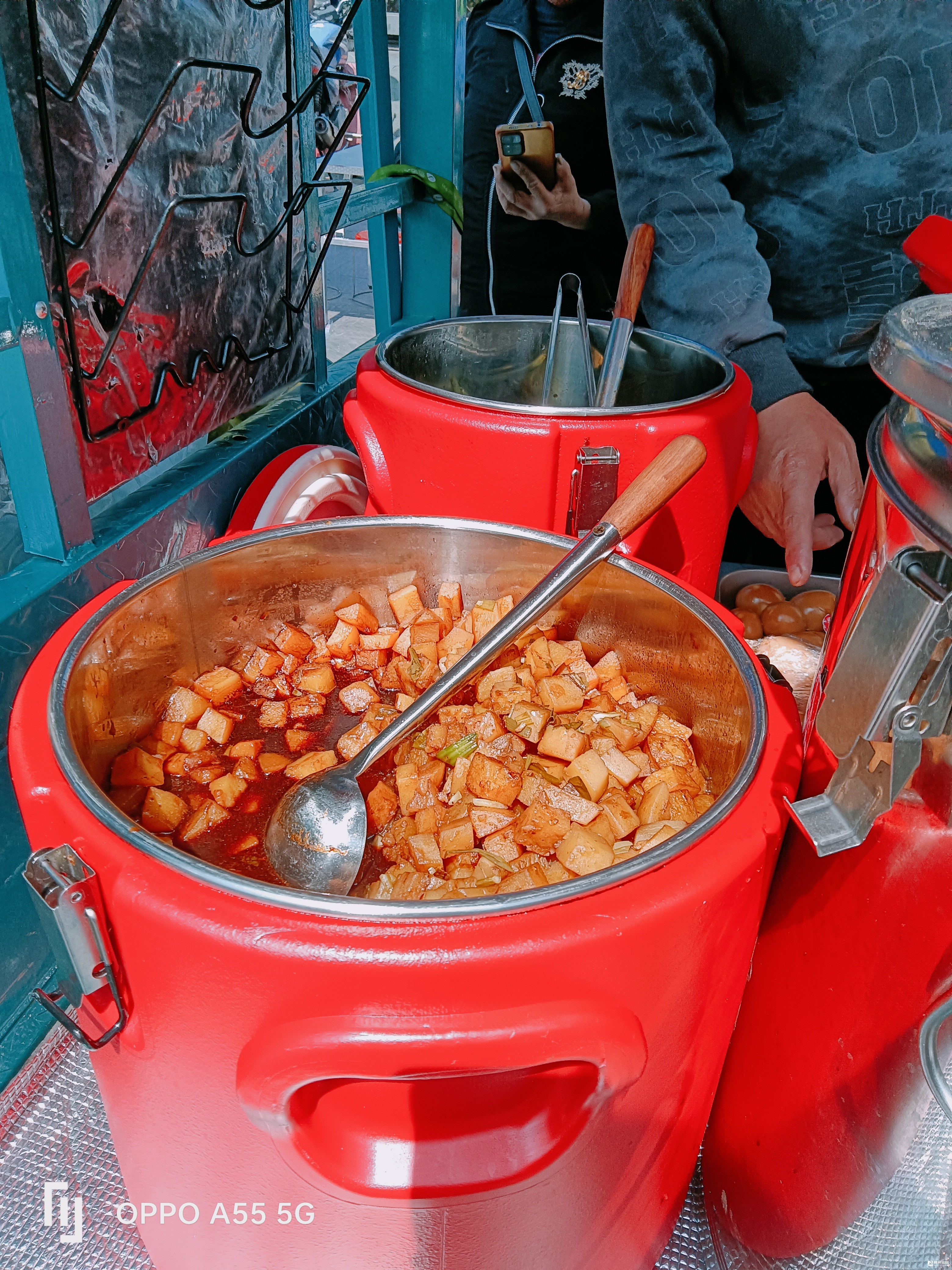 春日,艳阳高照,桥头上,中餐时分,又热闹了,一溜各种小吃摊,有坐着吃的,有站着吃的,人间烟火气又旺了……红烧肉盖浇饭13元一份,包含米饭,两个素菜,一亇卤蛋,红烧肉。还有鸡腿饭,8元一份,也含饭,两亇素菜,一个卤蛋。为了回答网友“红烧肉”怎么样,摊主舀一勺红烧肉给我看,热腾腾,肥瘦相间的五花肉,诱人的酱红色……食客多多……(第二张图是一桶红烧土豆)