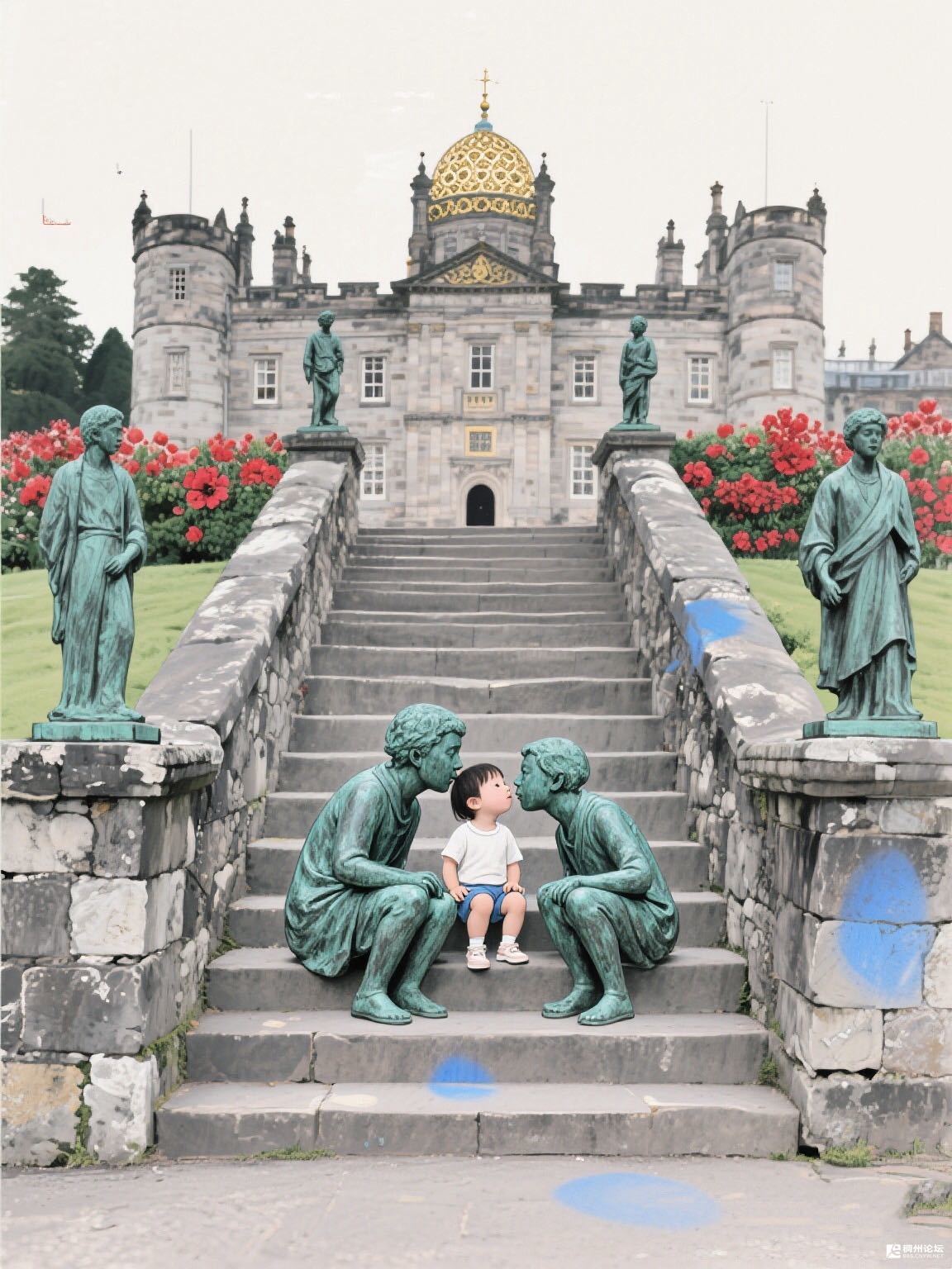 古堡的金顶在雾里发着暖光,红花开得像要把墙烧起来。可孩子不管这些,他只看见两个“大朋友”蹲下来,用青铜的温柔,圈出一方小小的、能装下整个童年的天地。