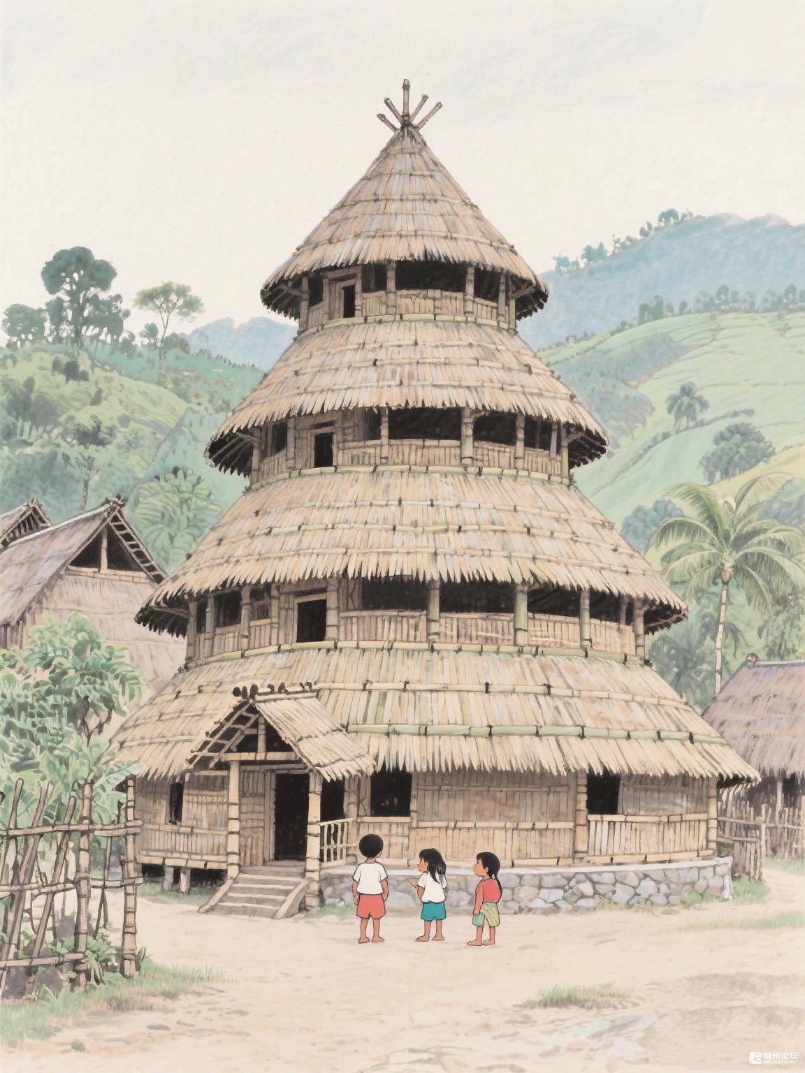 这屋子像把竹笋竖起来盖的,一层一层,草檐边还沾着露水的潮气。三个孩子仰着脑袋看,许是在猜每一层住着哪只鸟,或是藏着哪片云。