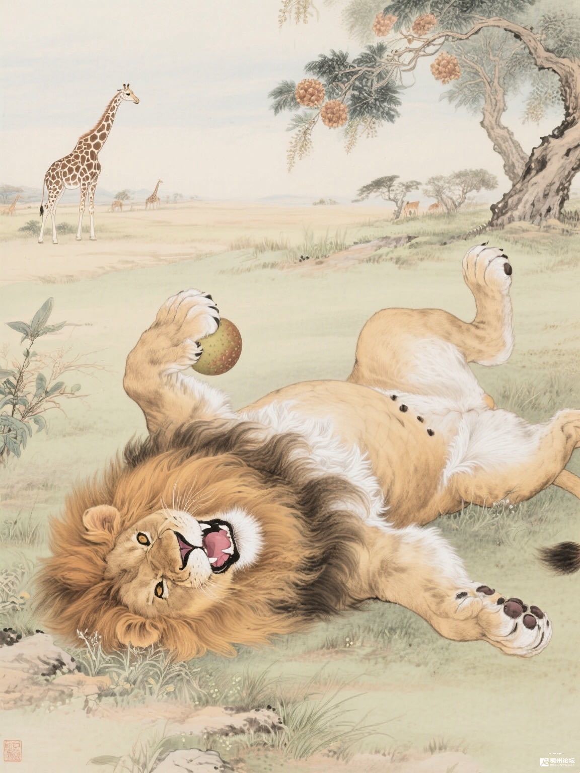它把自己摊成一张金毛毯子,爪子里攥着的果子,倒像是从天上掉下来的皮球。长颈鹿在远处抻着脖子看,许是在想:“草原之王今天改行当玩童了?”