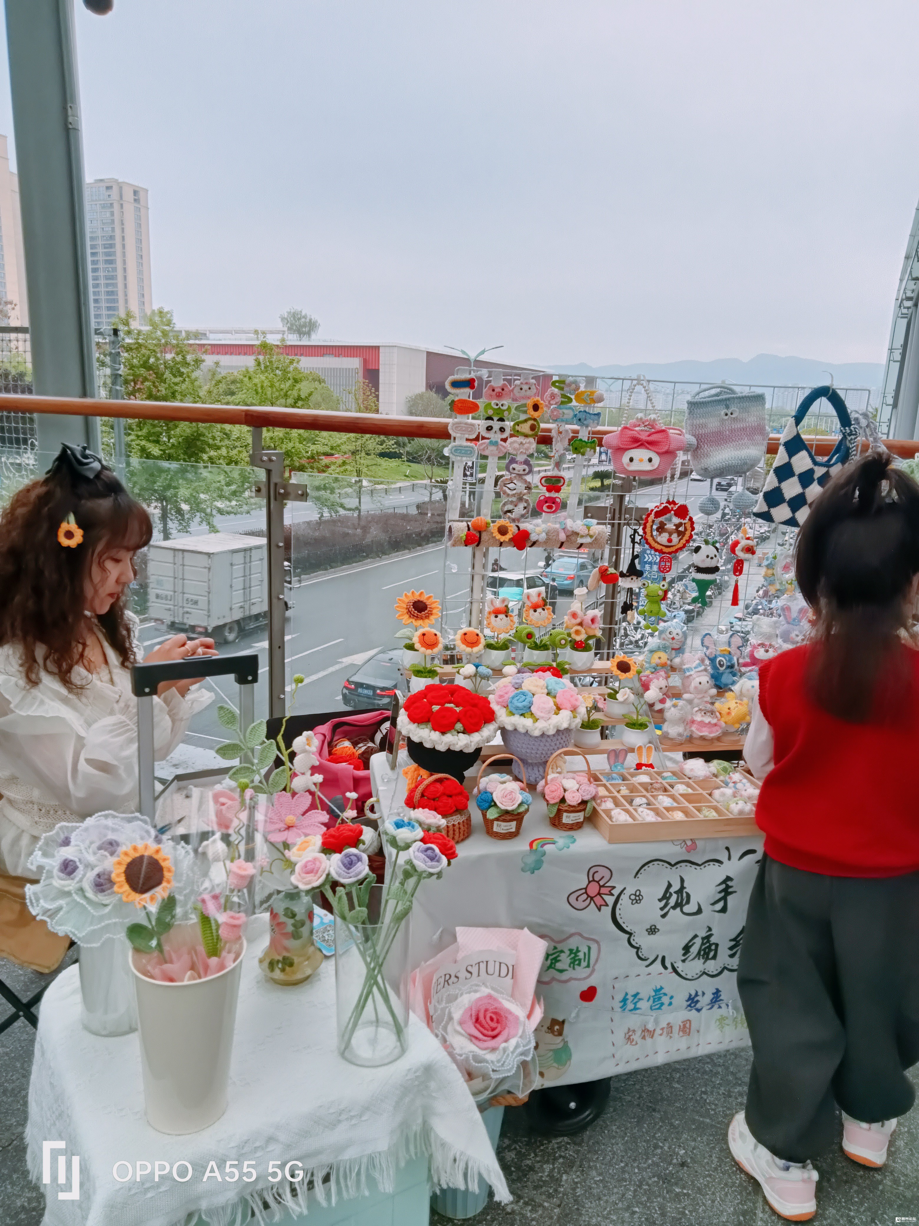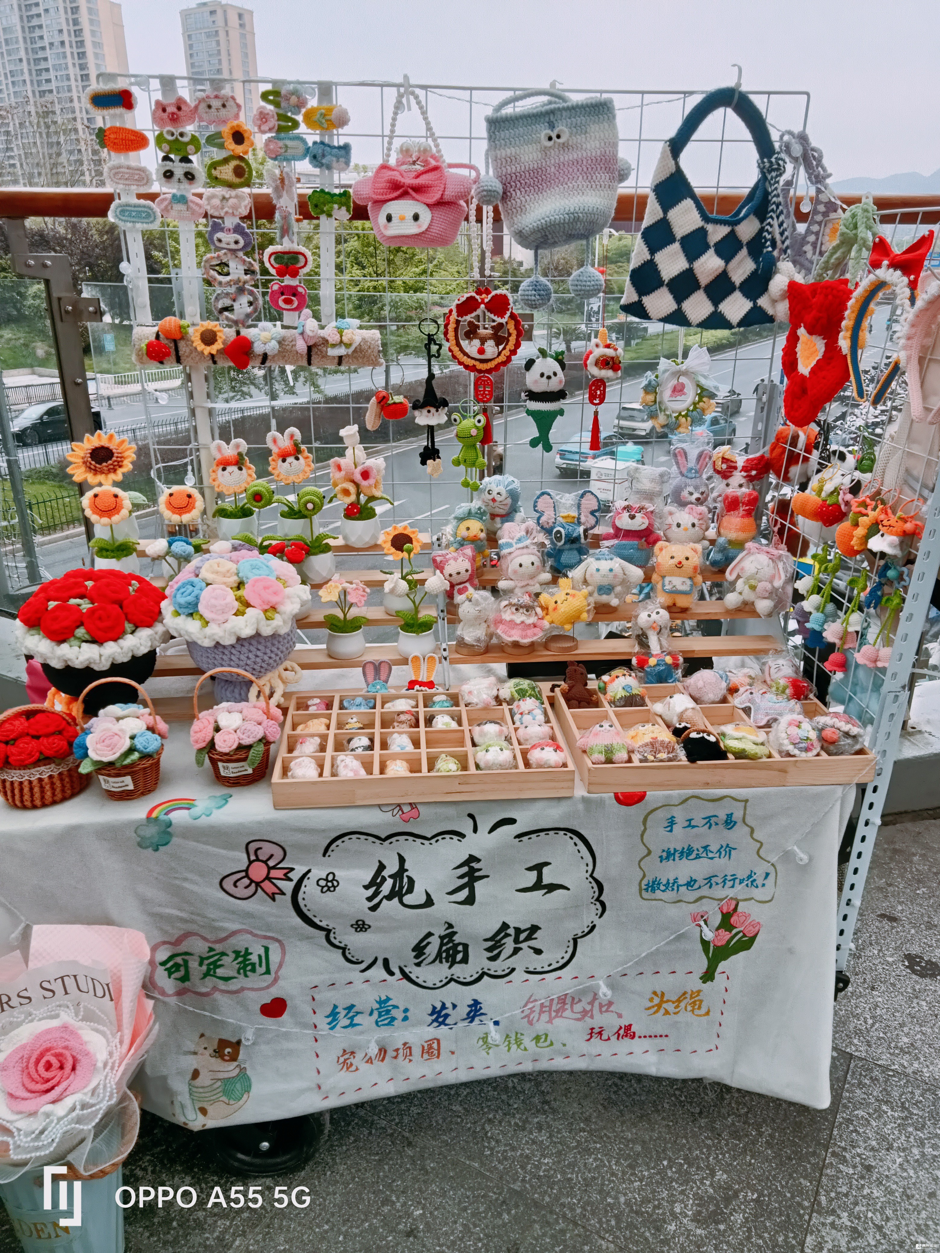 万达天桥上,小小摊位,挂满各种各样毛线编织,纯手工的饰品,挂件等,边编边售,也可定制,批零结合。小微创业,自强不息,值得借鉴……