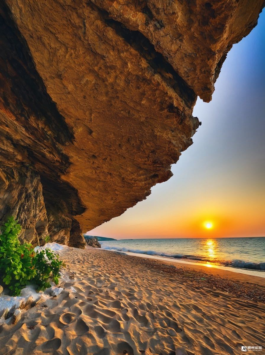岩石把自己弯成屋檐,替沙滩挡了挡夕照。浪推着金箔似的光往岸边走,沙上的脚印被挨个镀亮,像一串没写完的诗行。