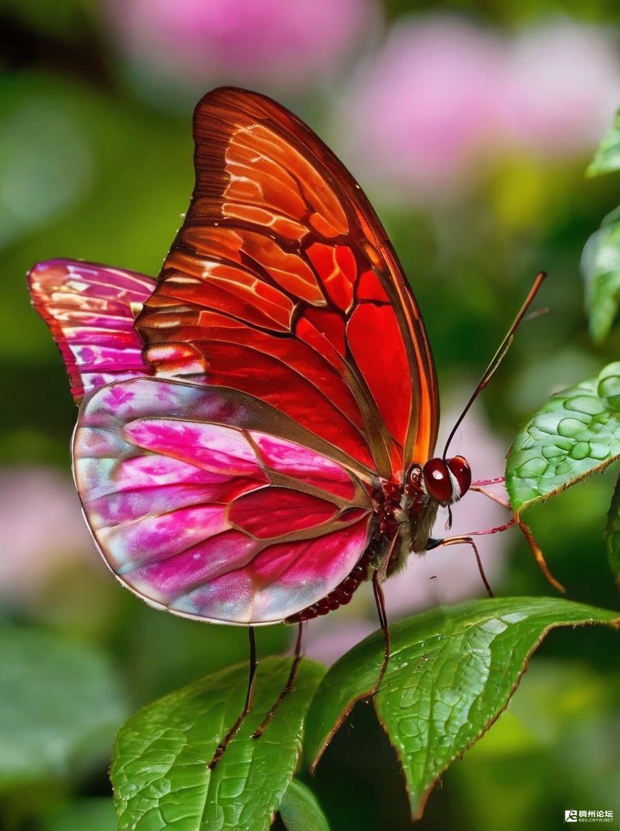 它翅膀上的红,是把朝霞揉碎了织进去的;粉紫的部分,像蘸了雾蒙蒙的春夜。触角轻颤时,我总疑心它在跟叶子说悄悄话——“你看这露水,圆得像糖豆呢”。