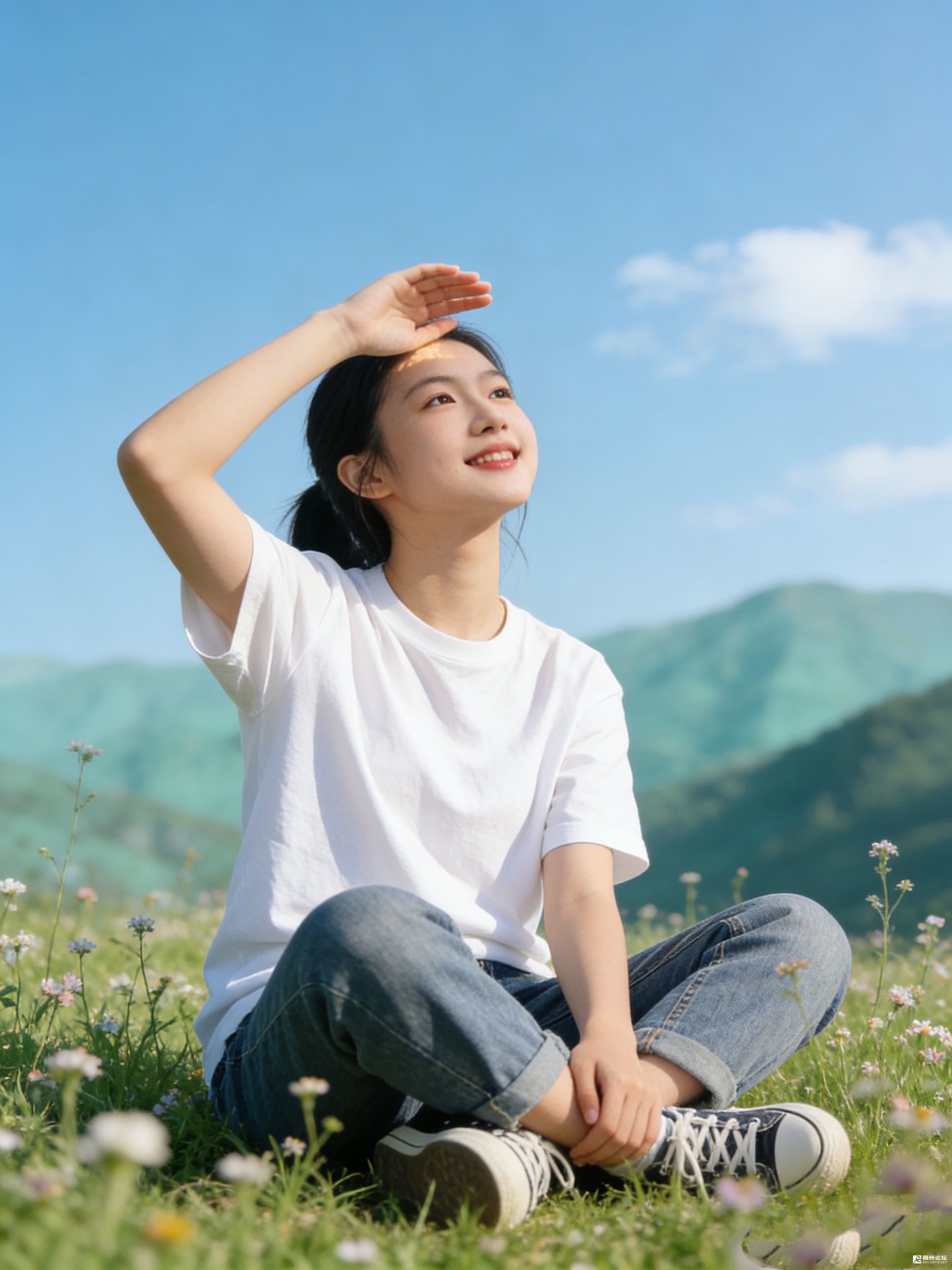 山在远处团成绿绒绒的云,倒像是天空把没吃完的糖,随手揉成了山的形状。她白T恤上落了点草屑,像沾了星子的碎屑——其实是阳光碎在上面,成了摸得着的暖。