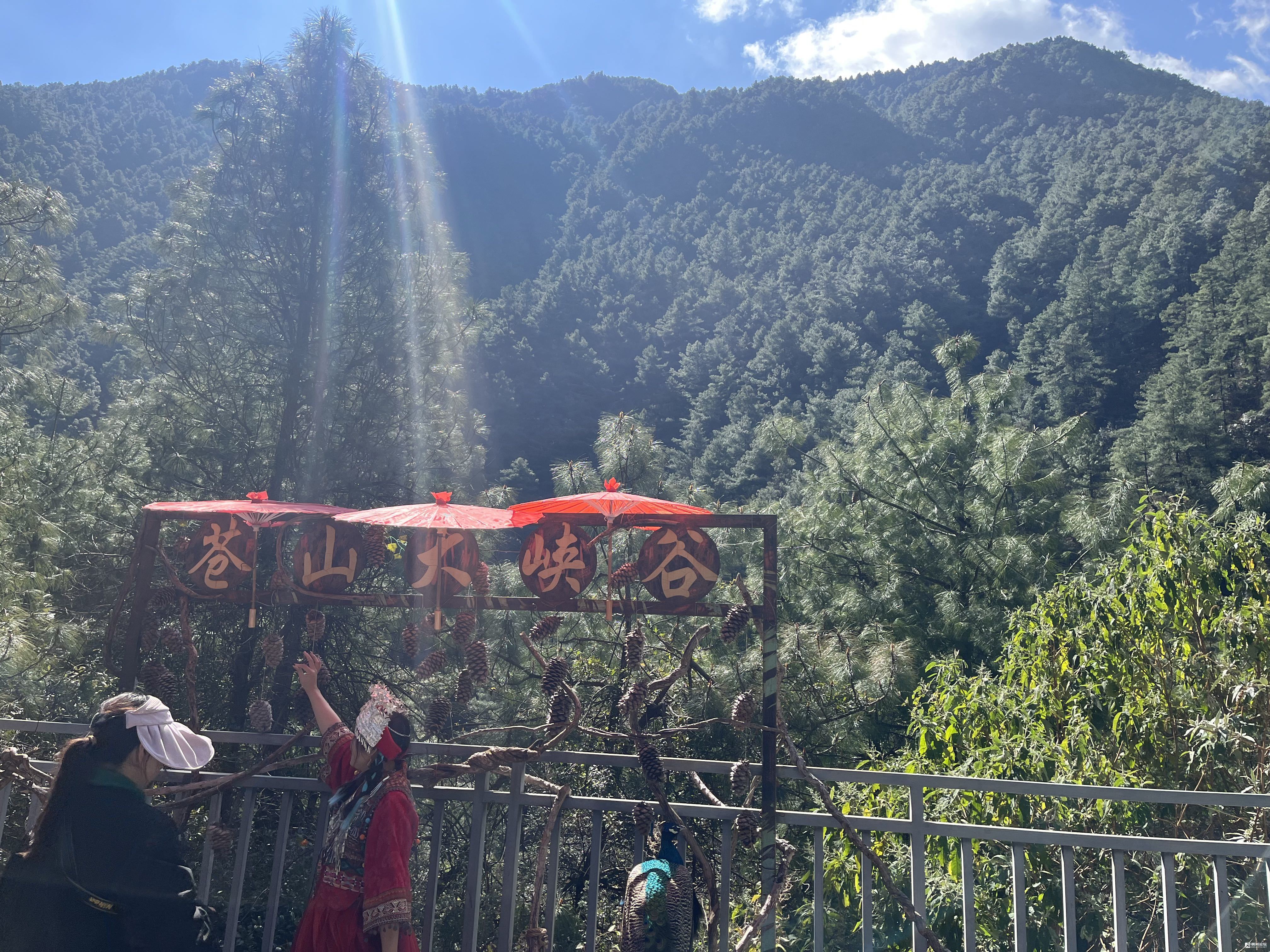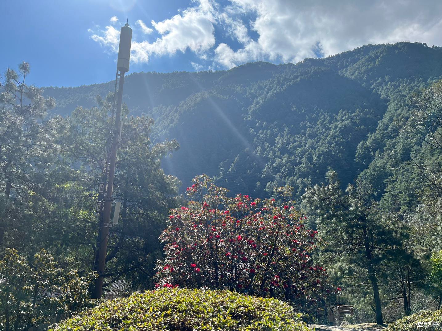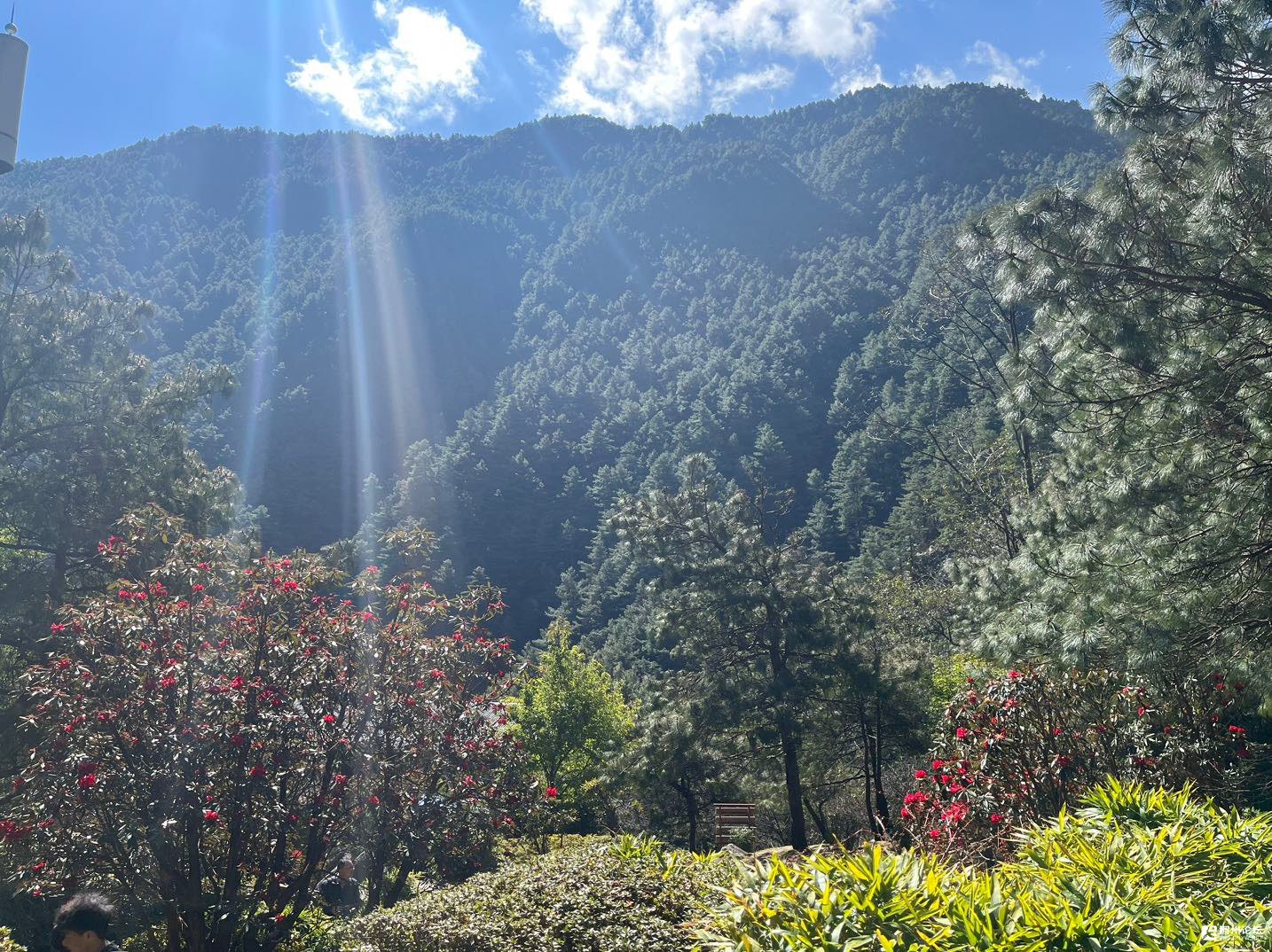 我与小蕾下了缆车,走出了缆车站,迎面便撞见了一幅超然的天然圣境。瓦蓝瓦蓝的天空飘着几朵白云,挨着天的苍山上云雾缥缈,植被茂密,风光旖旎,气势磅礴。各树种参天大树雀跃向天生长,挺拔壮观,十分养眼,高山杜鹃及各种鲜花开满了山岗,姹紫嫣红的奇特美景无不展现出春天的活力!啊!春天真好!大峡谷深处送来了馨香馥郁的清新空气,让人舒适无比。