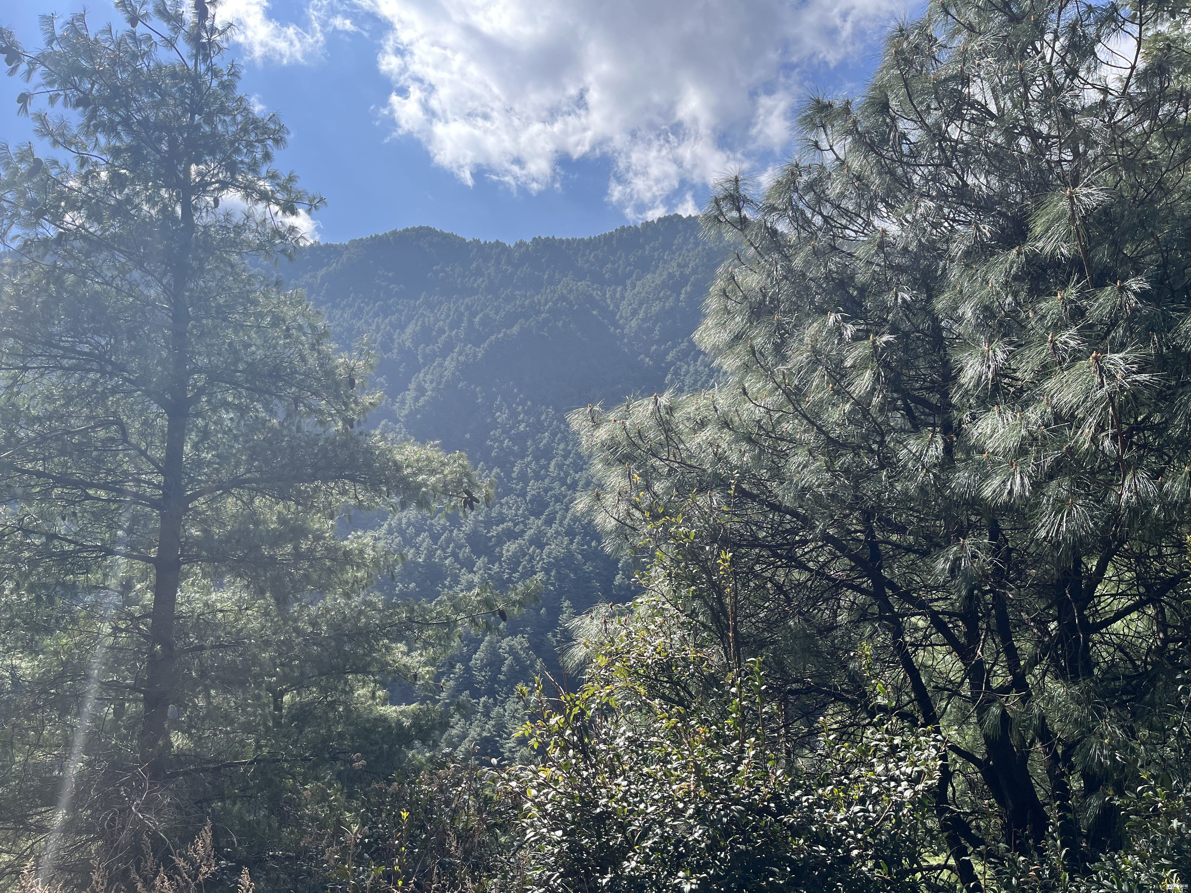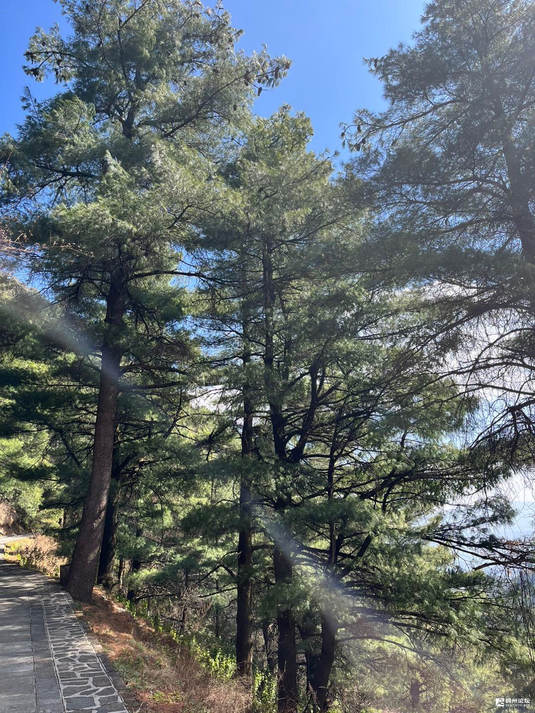 我俩站在玉带路上,不知是往左走还是往右走,最后决定往右边而去。玉带路两侧苍松翠柏高大挺拔,参天大树绿意盎然。走不几步,忽见林子里有二三只金丝猴在上下跳跃戏耍,玩得很欢,我刚想掏出手机拍照,猴子机灵,只听嗖的一声全不见了, 往林子深处逃去。我和小蕾等了好一会儿,不再有动静,只得悻悻地走了。放眼望去,只见五百里苍山云雾缭绕,高耸入云,峰峦叠翠,连绵不绝,风光旖旎,雄伟壮观。玉带云游路风光奇美,不觉让人流连忘返。看着时间差不多了,我和小蕾随即下山去了。