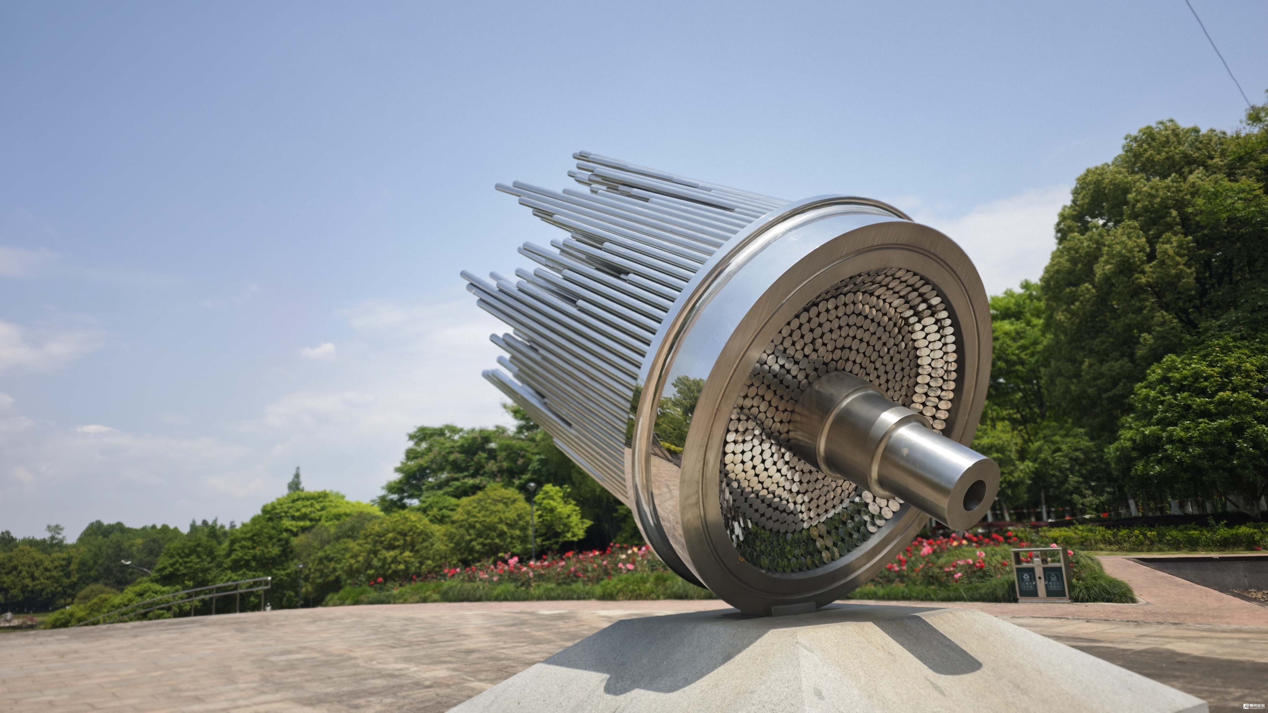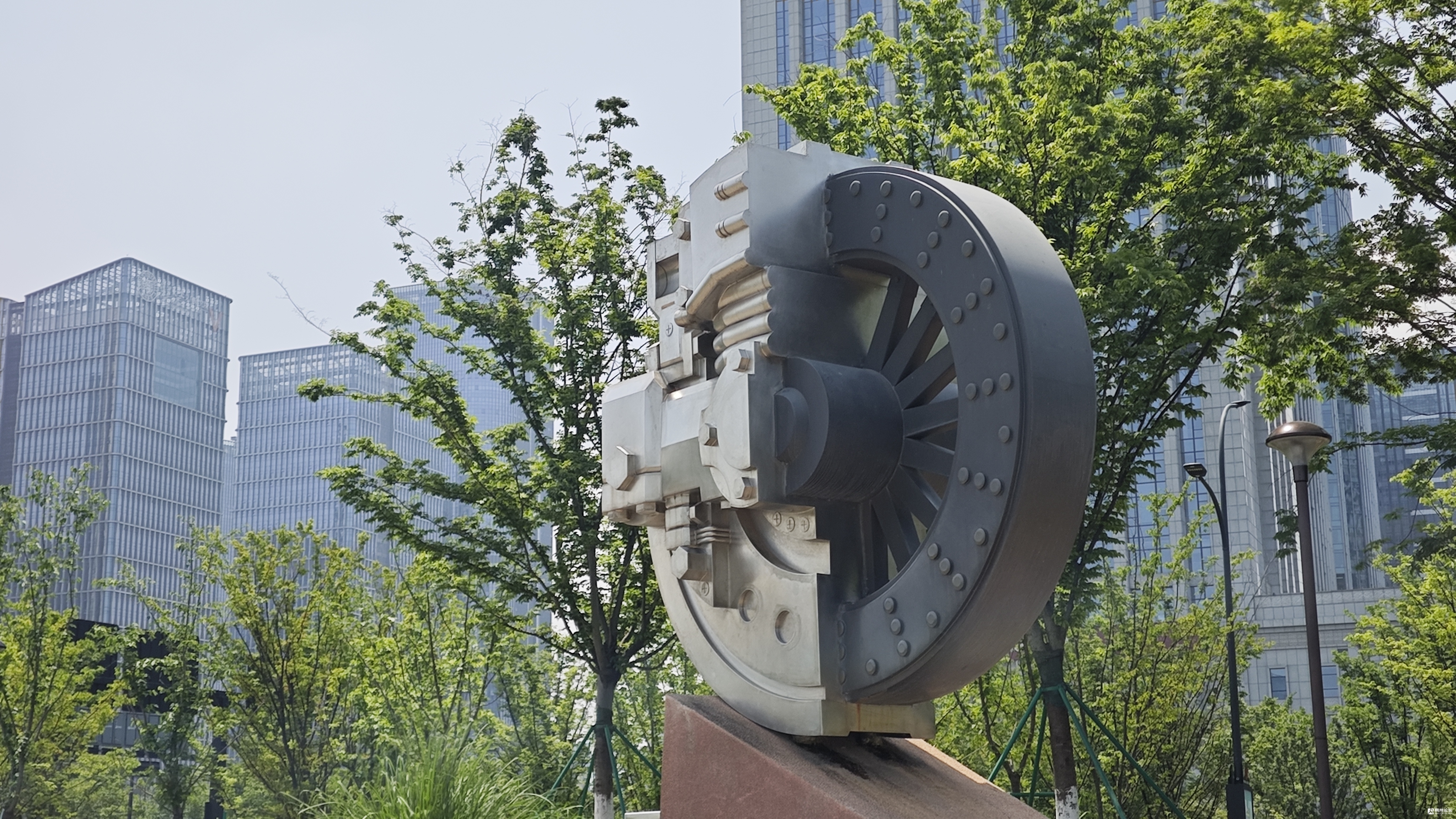 公园不仅是一片自然绿洲,也承载着城市的文化记忆。主入口的四季广场设有反映义乌市场变迁及“鸡毛换糖”场景的大型浮雕,园内还散落着《金乌之梦》、《苏武牧羊》等艺术雕塑,将生态景观与地方文化叙事巧妙融合。公园南入口处的雕塑《辙》,精致的不锈钢材质,依然保持着闪亮的金属光泽。