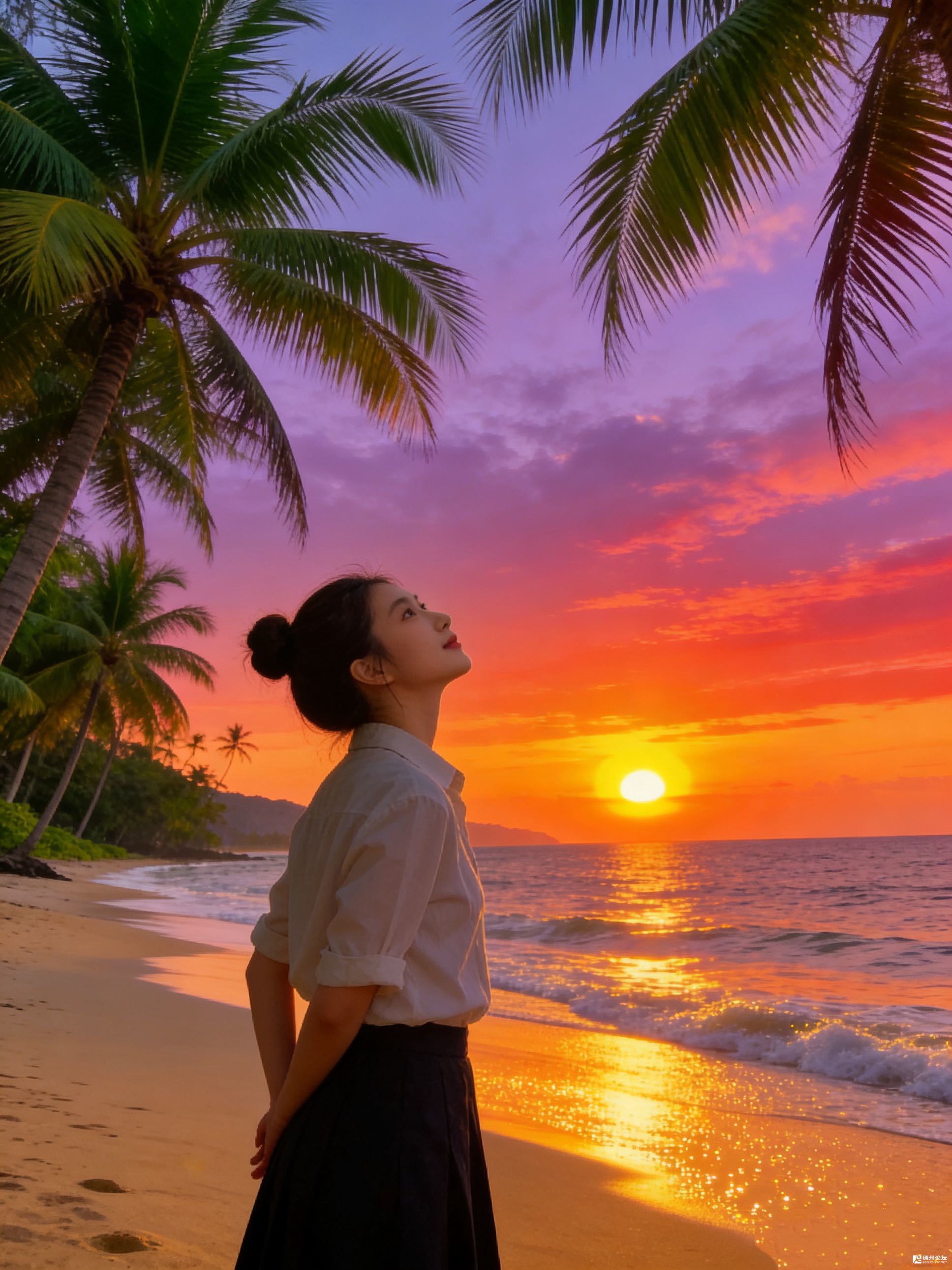 总有人说“日落是一天的收尾”,可在这儿,日落是新的开始。我把影子投进浪里,看它被染成暖橙色,倒像是把自己也浸在了这罐蜜糖里。海风掠过发梢,带着椰子的香,原来海从不是“辽阔”的代名词,它是会把光和暖,都熬成能捧在手心的甜的。