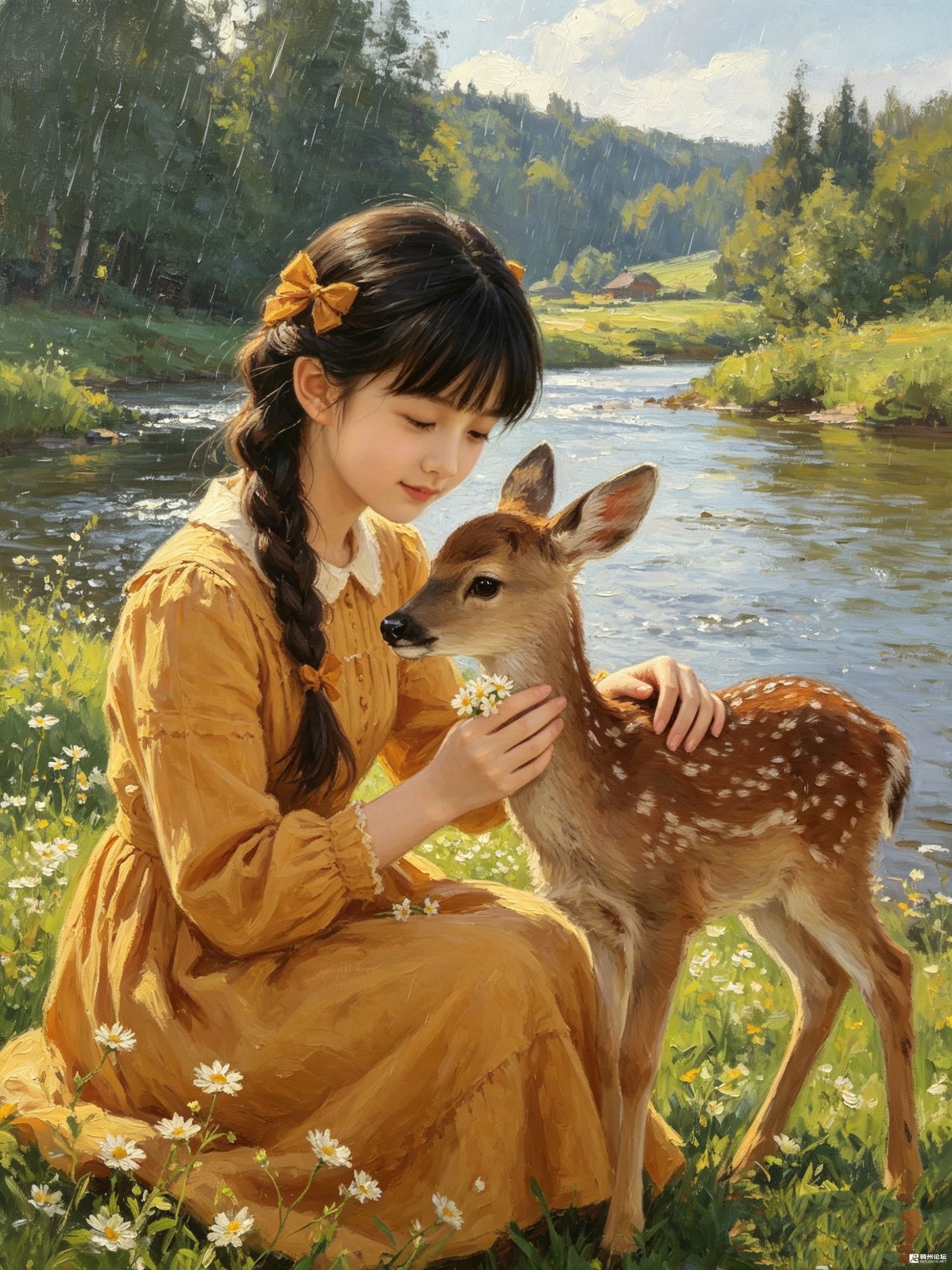 雨还在下,雏菊的白瓣沾了雨珠,亮得像糖霜。我摸着小鹿的背,觉得自己也成了这雨幕里的角色——不是人,也不是鹿,是被童话揉进雨丝里的、一小团暖黄的光。