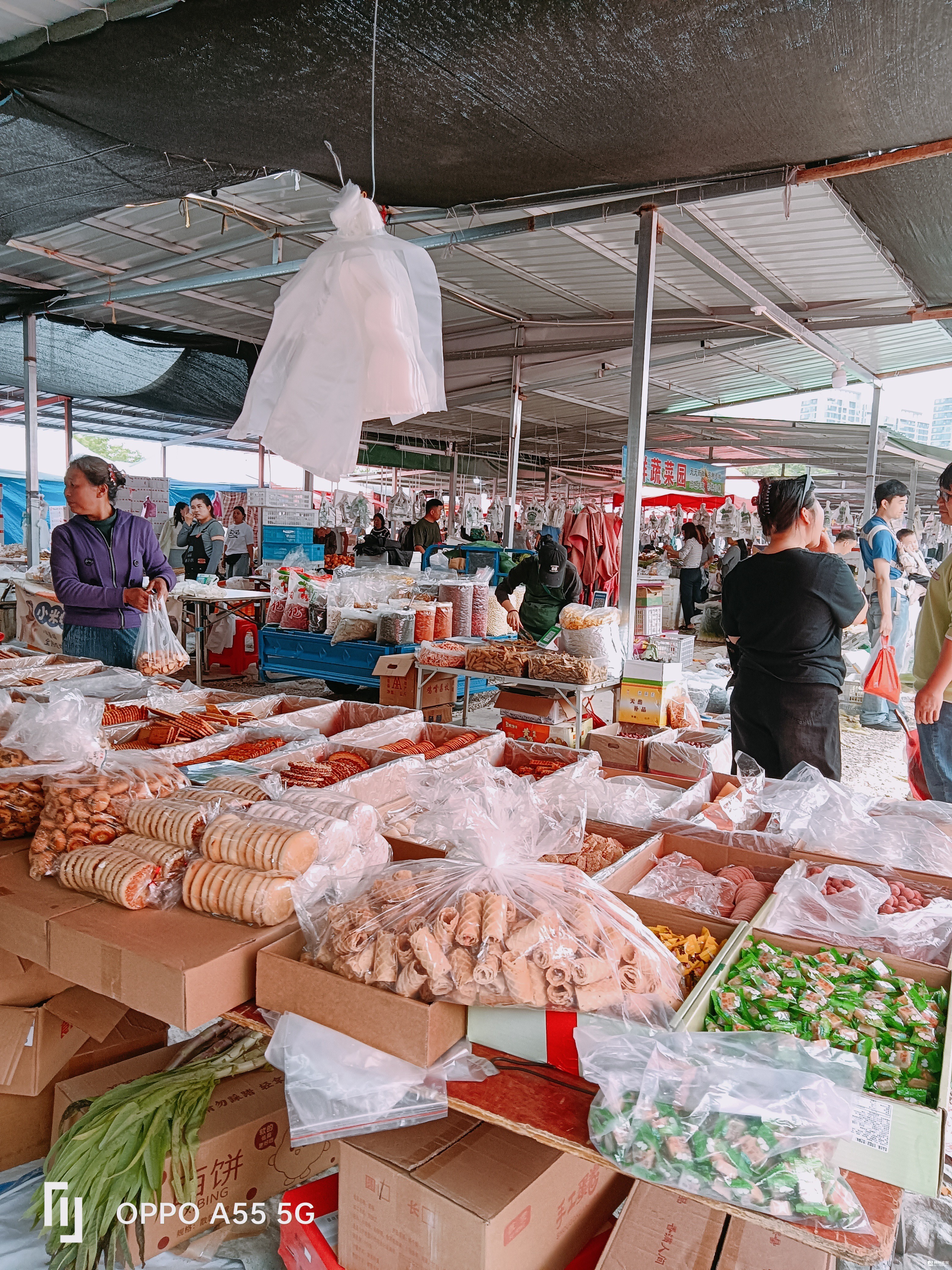 以前,江湾是露天乡集,偶遇下雨,没处避雨,有些尴尬。现搭了许多钢棚,一个连一个,如室内超市。面铺,特色小吃店,也盖了大钢棚房,下点雨,没优虑了。